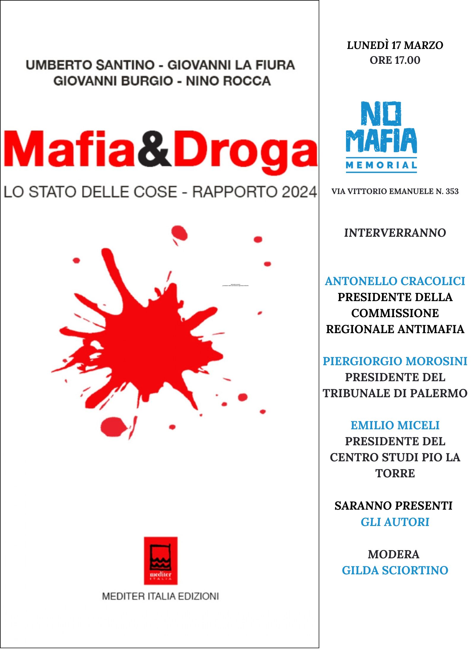 Fare il punto sullo stato delle cose rispetto al tema delle dipendenze attraverso chi opera sul territorio, a fianco degli operatori, delle famiglie, all’interno delle istituzioni, della politica. Lo si farà alle 17 di lunedì 17 marzo al NO MAFIA MEMORIAL, in via Vittorio Emanuele 353, prendendo spunto dal libro “Mafia&Dtoga. Lo stato delle cose. Rapporto 2024”, edito da Mediter Italia, a cura di Umberto Santino, Giovanni La Fiura, Giovanni Burgio e Nino Rocca.
