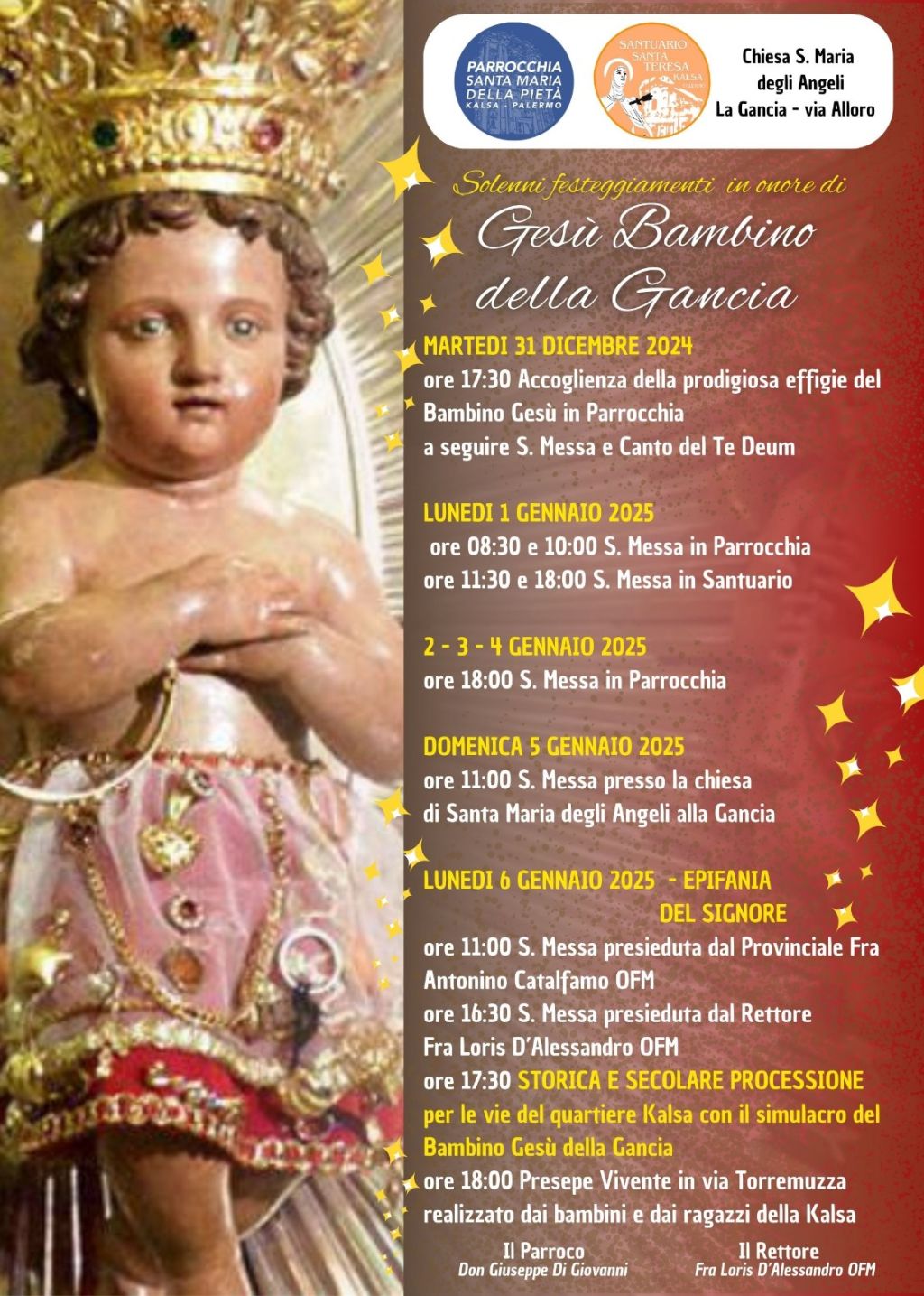Già nella mattinata del 6 gennaio, alle 11, sarà celebrata una messa nella chiesa della Gancia, presieduta da Fra Antonino Catalfamo, ministro provinciale dei frati minori di Sicilia. Nel pomeriggio alle 16.30 altra  celebrazione eucaristica presieduta dal rettore Fra Loris D’Alessandro.