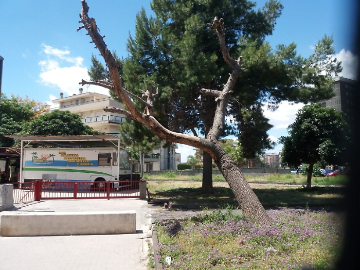 Via Alcide De Gasperi pino pericoloso, civico 46 vicino l'ufficio postale come si può vedere questo Pino passato a miglior vita pende sulla testa dei passanti o di chi si siede sulla bella panchina. Ora mi chiedo perché il lavoro non è stato completato? Le radici sotto terra marciscono. il peso del tronco e dei rami portanti vista l'inclinazione potrebbero collassare in qualsiasi momento causando anche la morte di chi in quel momento transita vicino. Dobbiamo aspettare questo ?