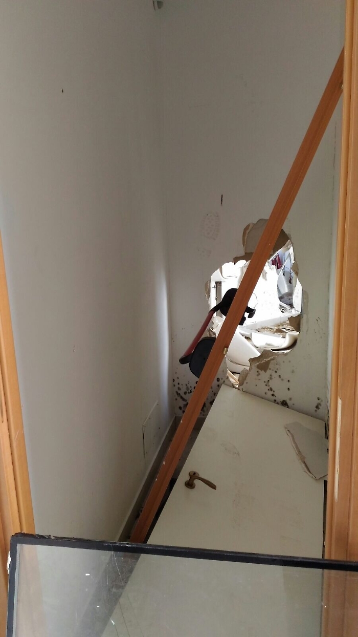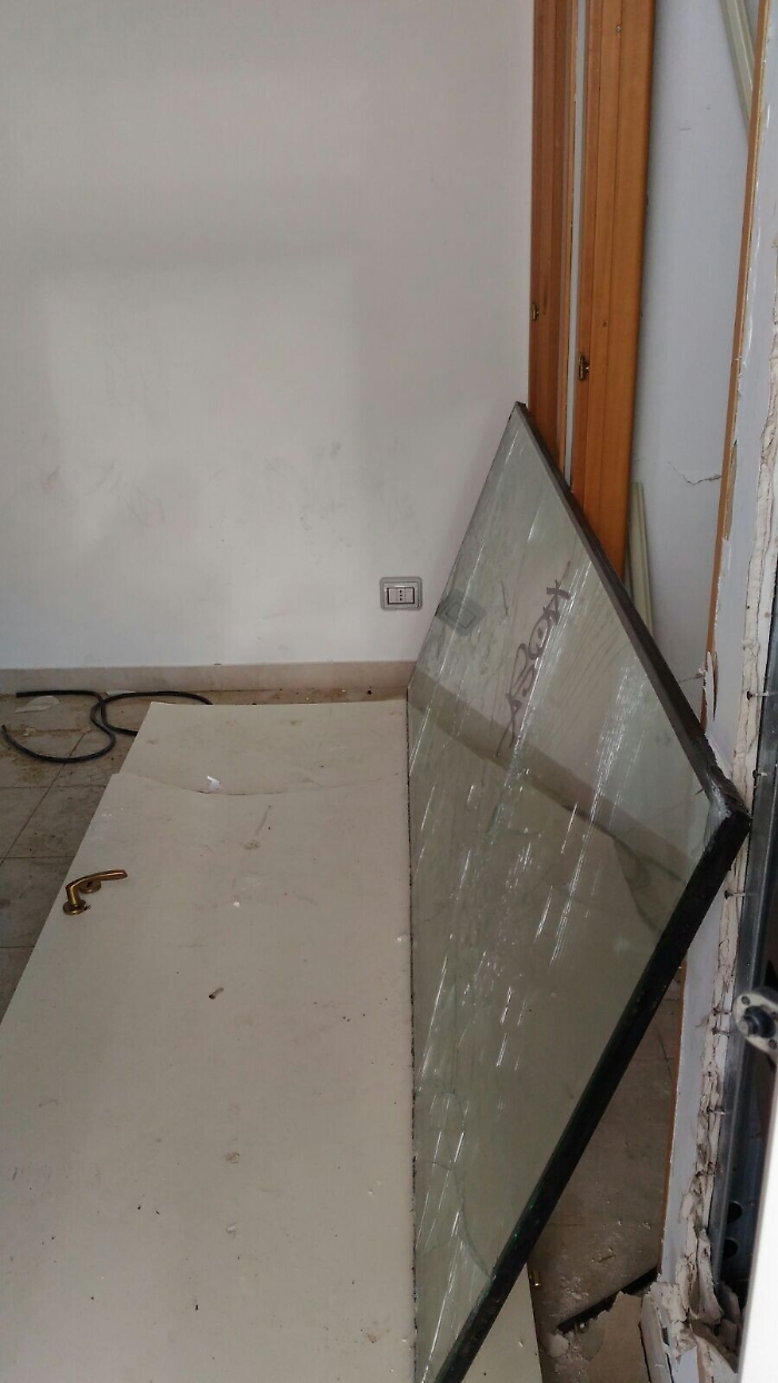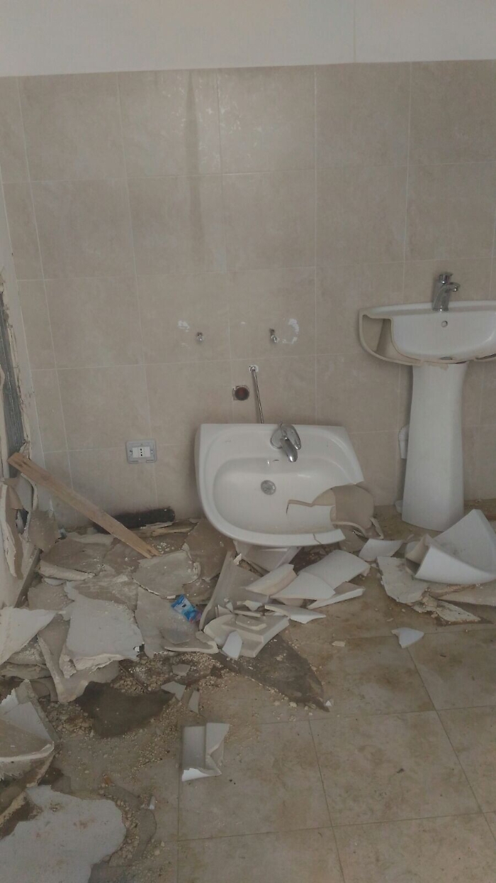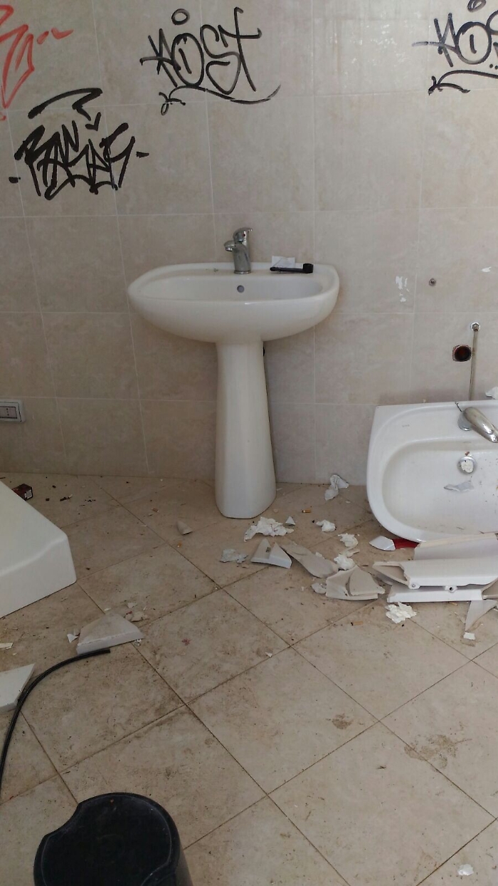 È stato completamente distrutto dai vandali . Notare i servizi igienici.
