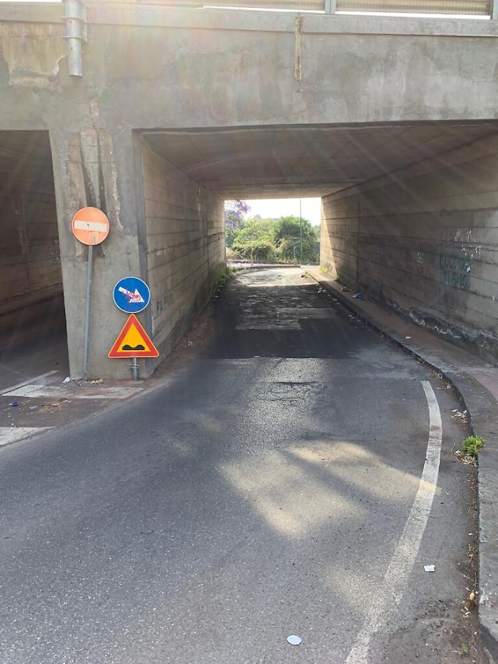 Segnalo la pericolosità in cui si trova questa strada soprattutto per chi viaggia a 2 ruote. È via Cerza, come vedete hanno pure messo un cartello con segnalazione "dune" (a mio parere le dune sono un’altra cosa). La strada proprio sotto il ponte è in condizioni di estremo pericolo come si evidenzia nelle foto.