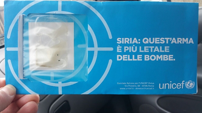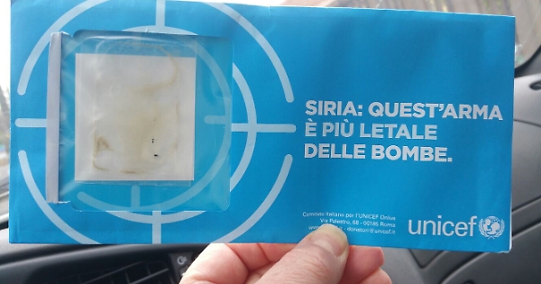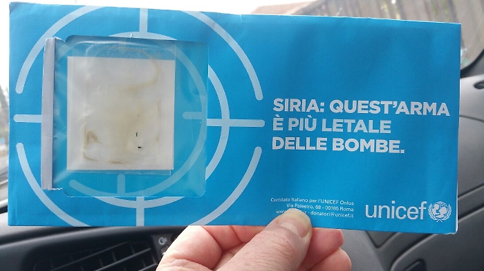 volevo segnalare il recapito particolare di una lettera inviatami dall'Unicef. Vediamo se vi sembra normale che nella mia cassetta della posta vi trovi una lettera del genere con in evidenza una bustina con del liquido marroncino dentro. Ma secondo questi signori, con i tempi che corrono (attentati e di tutto e di più), si può aprire una lettera del genere?