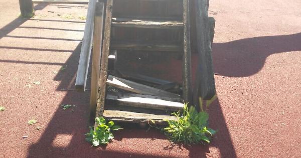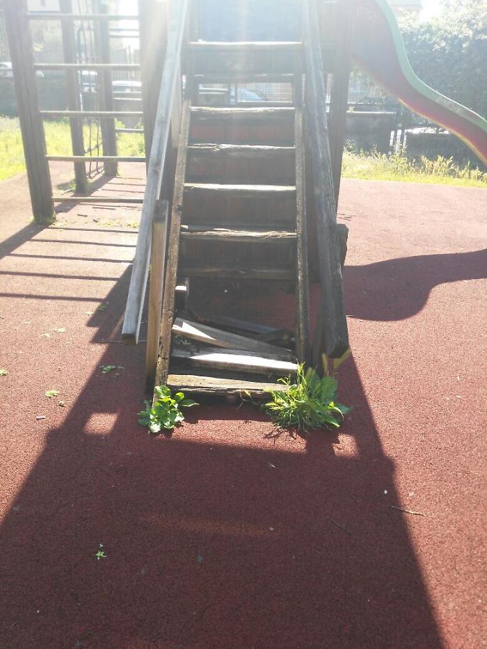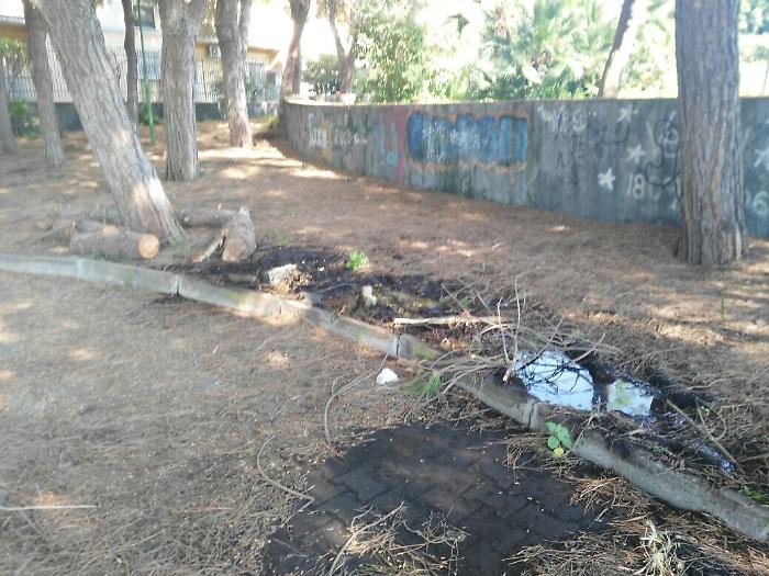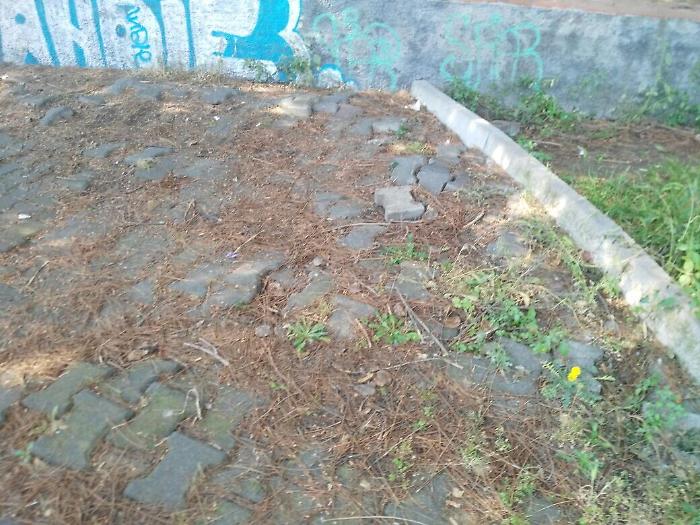 La pavimentazione risulta divelta in alcuni tratti, fuoriuscite d'acqua di chissà quale natura , sterpaglie dappertutto , i giochi per i bambini sono usurati e la scala della scivola distrutta dalle intemperie. In sostanza una boscaglia pericolosissima a rischio incendio.