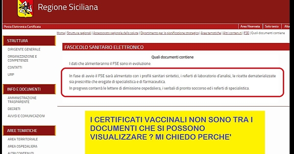 Ogni Regione deve alimentare i dati dei propri cittadini nel FASCICOLO SANITARIO. Grazie a questa banca dati, come recita il portale governativo, si può accedere ai propri certificati vaccinali Covid, che si possono esibire per i viaggi di lavoro o per turismo. Il mio medico curante ha inserito prontamente da diversi giorni il mio certificato vaccinale Covid (prima e seconda dose) nel portale del FASCICOLO SANITARIO. Ho lasciato passare qualche giorno e ho fatto accesso al mio fascicolo sanitario per stampare il certificato, ma non l'ho trovato. Questa mattina, cercando i contatti nel portale, per lamentare il disservizio, trovo la sorpresa che potete vedere nell'immagine. Mentre a livello nazionale è prevista la ricerca di tutti i documenti, anche i certificati vaccinali (con apposita selezione per la ricerca di che trattasi), in Sicilia pare non sia prevista nemmeno la visualizzazione. Mi chiedo anche perchè tutti questi passaggi, quando il certificato esiste già nella banca dati dell'HUB vaccinale?