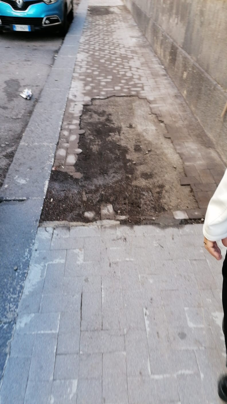 Catania, via Papale: marciapiede disconesso e tombini otturati