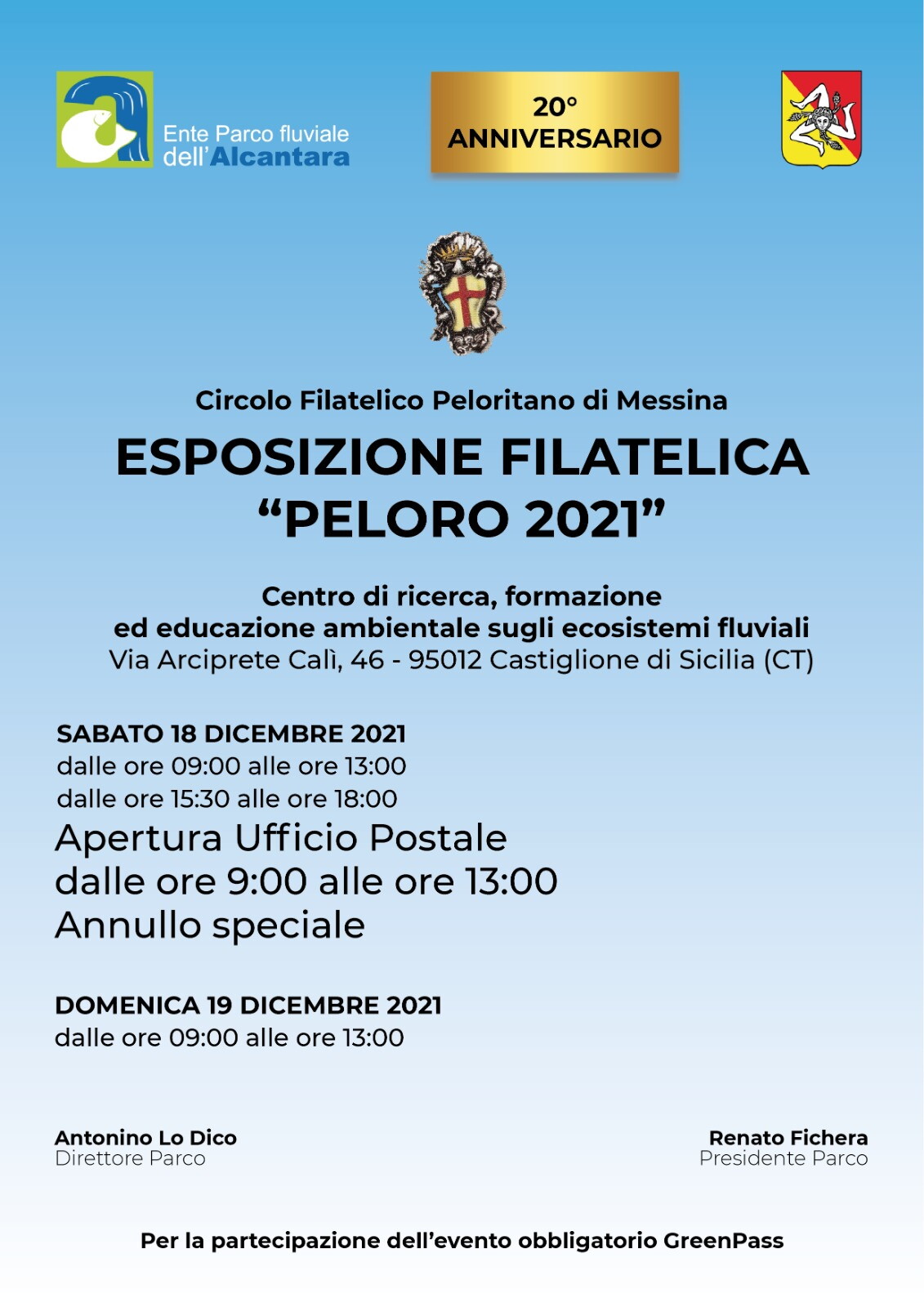 Il Circolo Filatelico Peloritano ha programmato la Mostra "Peloro 2021" a Castiglione di Sicilia per il 18 e 19 dicembre 2021 in occasione del Ventennale di fondazione del Parco Fluviale dell'Alcantara. Saranno esposte dieci collezioni suddivise in tre Sezioni: "Geologia", "Vite e vino" e "Tematiche varie del territorio". Sabato 18, sempre nella sede del CEA (Centro di Ricerca, Formazione ed Educazione Ambientale sugli Ecosistemi Fluviali), sarà attivato un Servizio distaccato di Poste Italiane dotato di un annullo speciale che potrà essere impresso su cinque differenti cartoline ufficiali. Il tutto avverrà nel pieno rispetto delle disposizioni anti-Covid.
