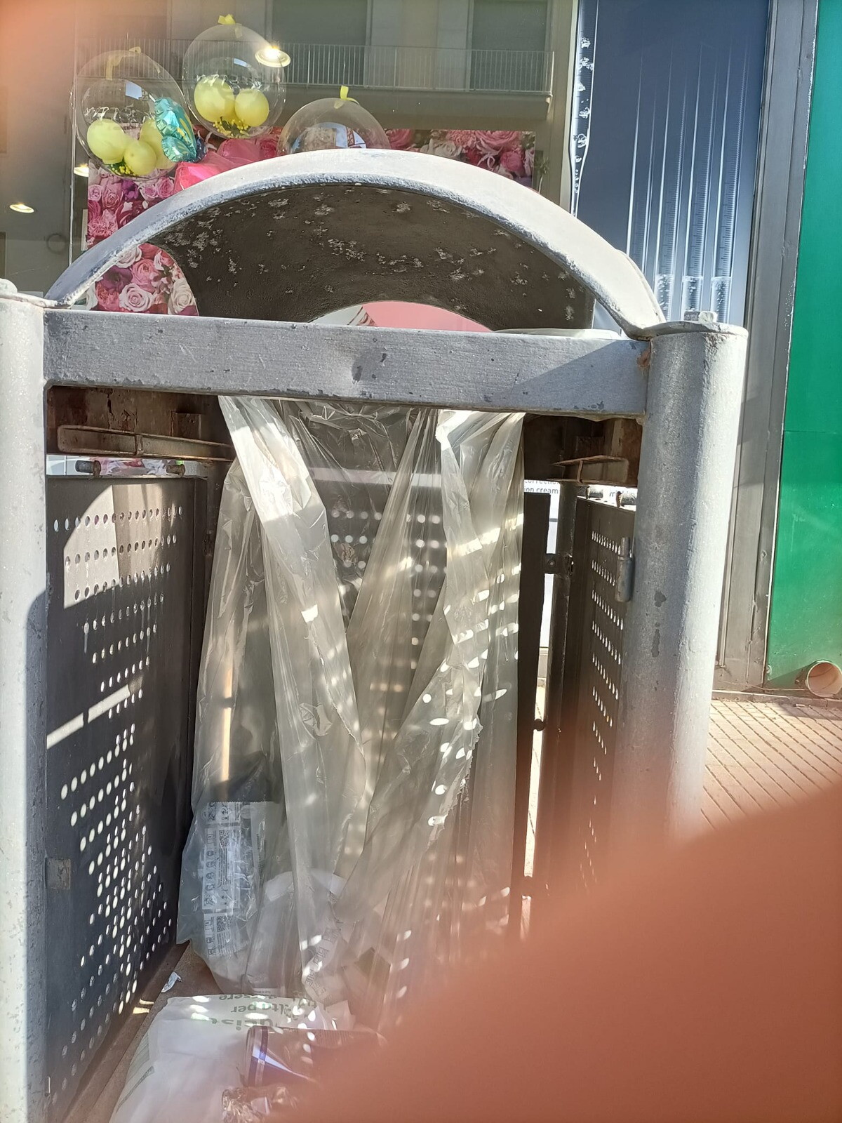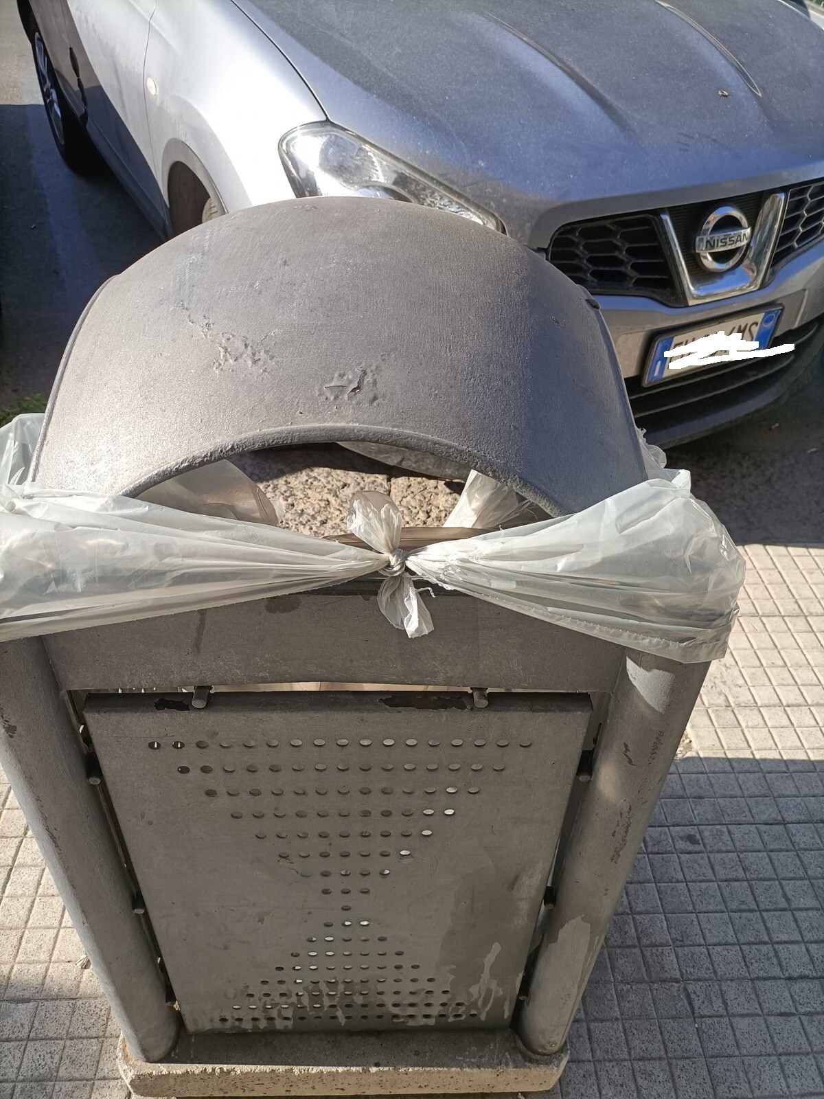 Più avanti poi, nel cestino davanti all'entrata della farmacia di via D'Annunzio è possibile scorgere un bel cestino con assenza di scheletrato in metallo per porre il sacchetto dei rifiuti e una busta per di più spaccata al centro annodata alla meno peggio.”