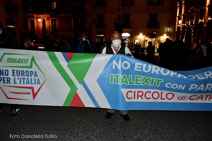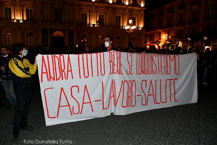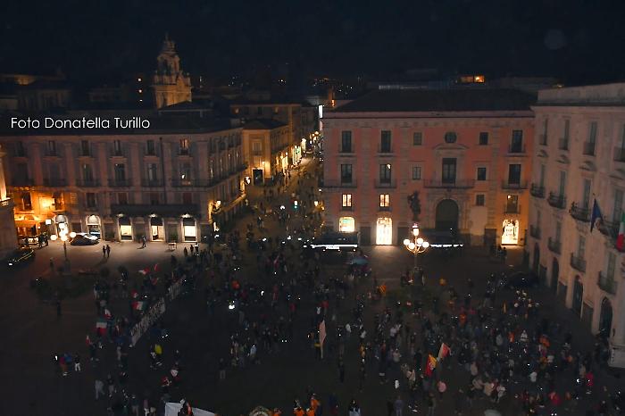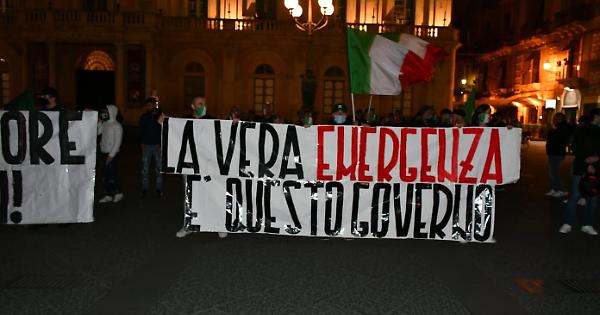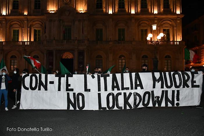 “La vera emergenza è questo governo”, si legge in uno degli striscioni. Catania scende in piazza per la seconda volta: la protesta di commercianti, ristoratori e varie categorie del mondo della ristorazione, contro il dpcm del governo che ha imposto la chiusura anticipata per diverse attività e quella totale per il mondo dello sport. Piazza Università è stata presidiata dalle forze dell'ordine ma non ci sono stati particolari disordini da segnalare: sono state lanciate le due bombe carta senza alcuna conseguenza per i manifestanti che in quel momento si trovavano a distanza.
