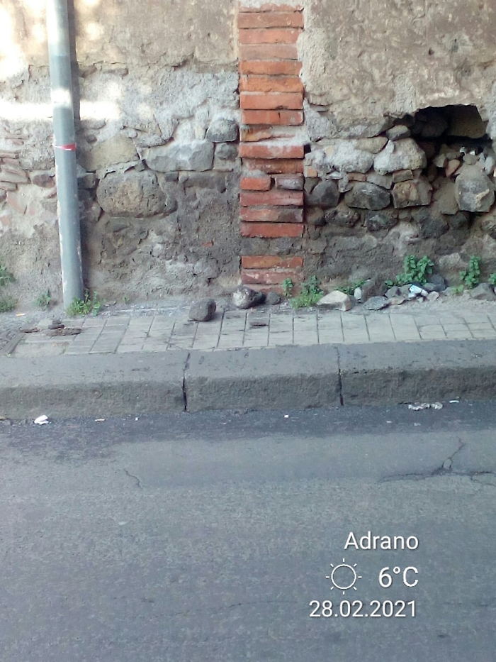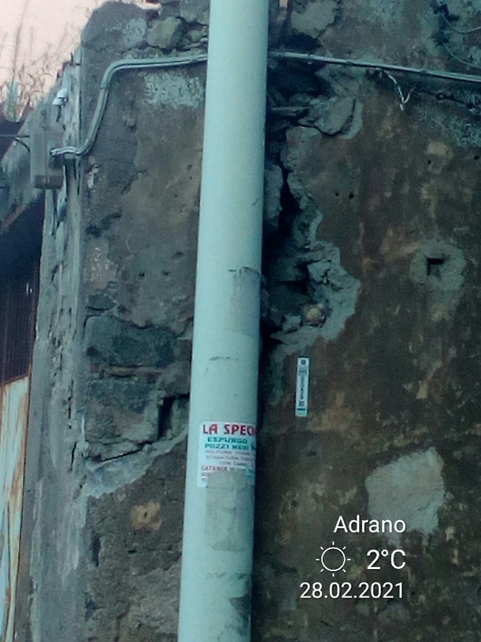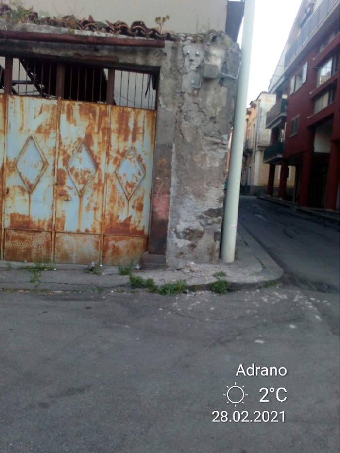 Adrano in via De Felice angolo angolo piazza Genova edificio abbandonato cade pezzi di intonaco e molto per pericoloso per automobili e pedoni alcuni passanti hanno telefonato alla polizia municipale gli hanno risposto non potevano venire a transennare l'area perchè non hanno mezzi a disposizione vergogna