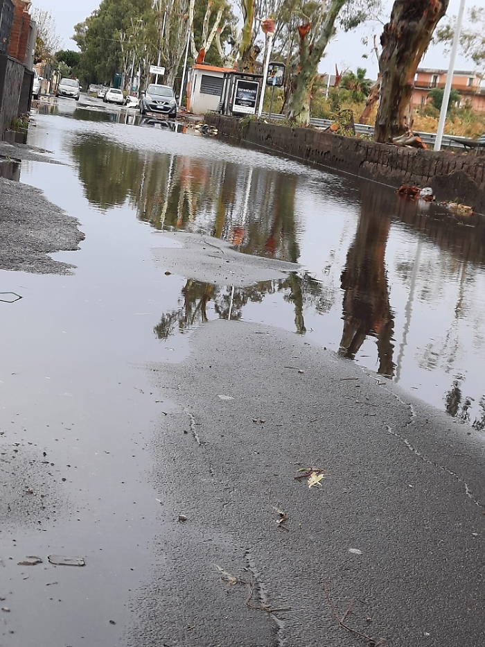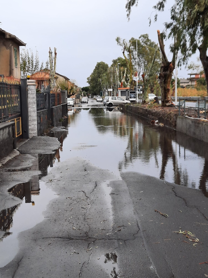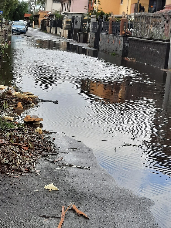"Questi sono i risultati, strade allagate per mancanza di pulizia caditoie, causato dal materiale di risulta non raccolto. L'assessore ancora deve fare una disposizione di servizio per intervenire, voglio ricordare al sig. assessore sono passati nove giorni ed considerata la situazione rischio per tutta la zona sud è soprattutto il VILLAGGIO SANTA MARIA GORETTI!!! cosa dobbiamo aspettare? Purtroppo la verità è che siamo in periferia e non veniamo considerati.