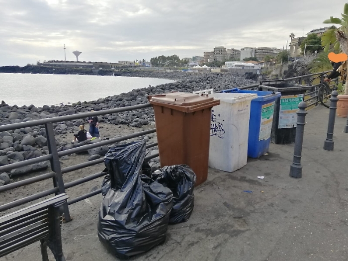San Giovanni li Cuti: il "gradevole" spettacolo degli sporchi contenitori disposti proprio in bella vista, accanto a una panchina...