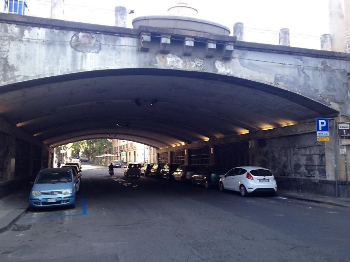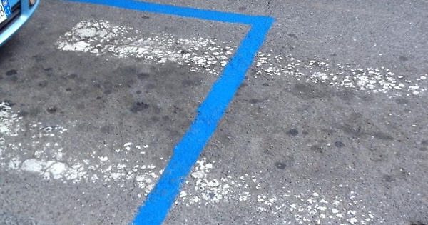 Via Sant'Euplio Catania. Strisce blu sopra le strisce pedonali