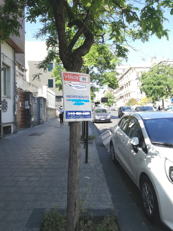 Purtroppo, ancora nessuno prende seri provvedimenti per questi sporcaccioni che oltre a deturpare le facciate cittadine, se la prendono anche con la natura. Si invita il Comune ad intervenire. Le foto sono state scattate in viale Mario Rapisardi pressi civico 27 e in via Lavaggi angolo via Lombroso.