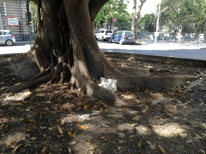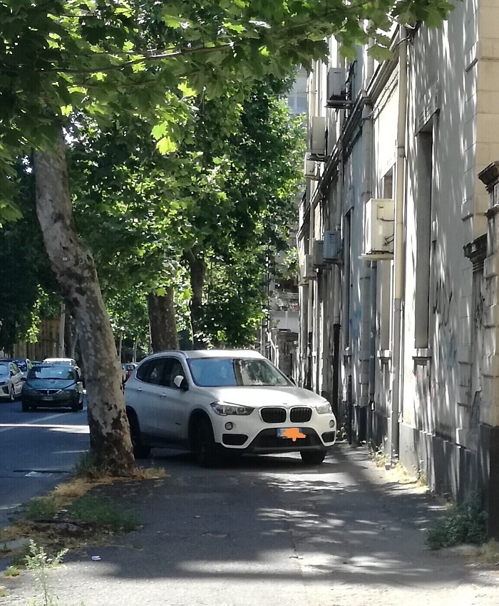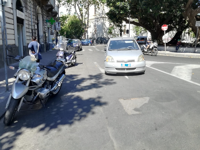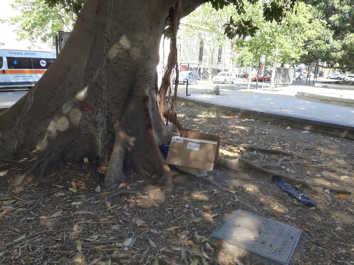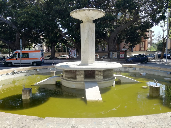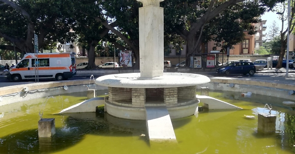Degrado e inciviltà in piazza Santa Maria di Gesù e via Androne. Fontana sporchissima e senza acqua, auto parcheggiate in mezzo alla strada o interamente sui marciapiedi.