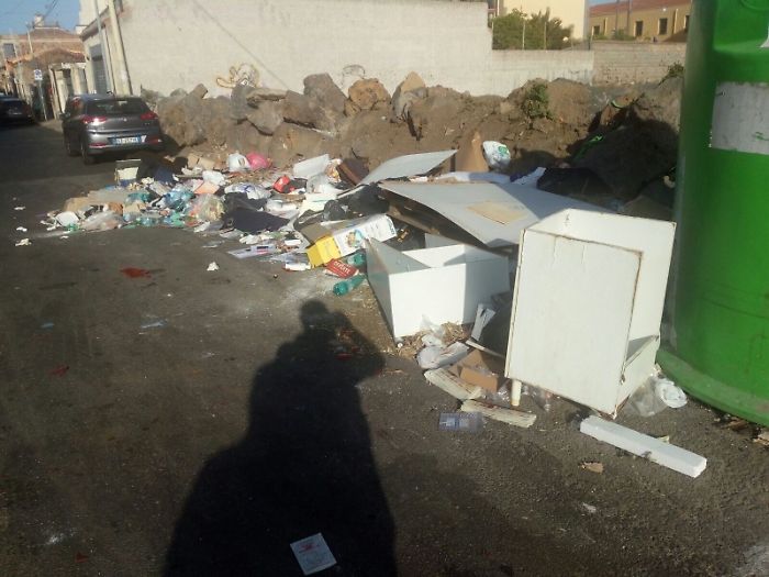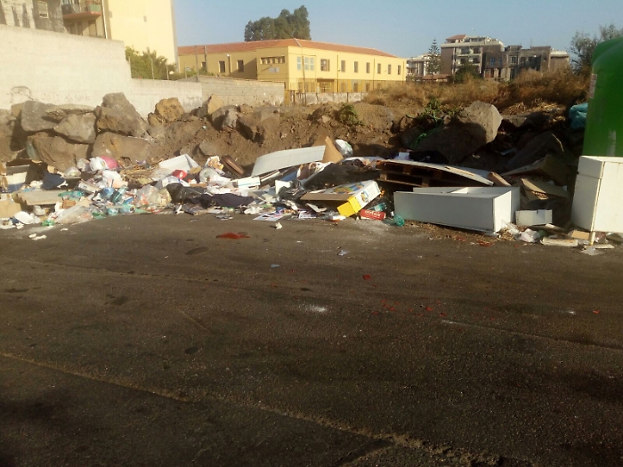 Da quattro giorni assistiamo a questo bello spettacolo. Ogni sera gli operatori ecologici svuotano i cassonetti ma non si degnano di raccogliere e pulire per terra. Tra l'altro c'è anche un foglio abbastanza grande di eternit. Ho chiesto loro di pulire e mi hanno risposto che non è di loro competenza. Mi chiedo se non tocca a loro, chi dovrebbe pulire?