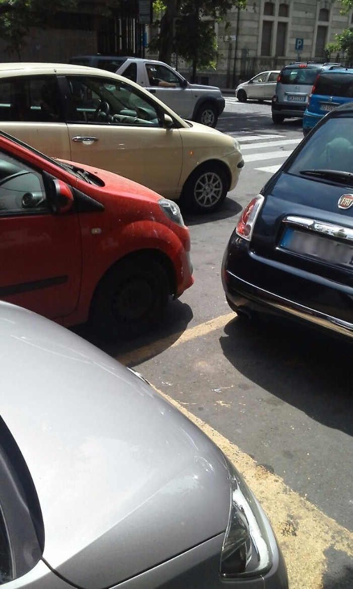 Tripla fila in viale Vittorio Veneto....ore 11,30...circa... Però, la signora che ha comprato le sigarette... ha avuto l'accortezza di non parcheggiare sulle strisce.