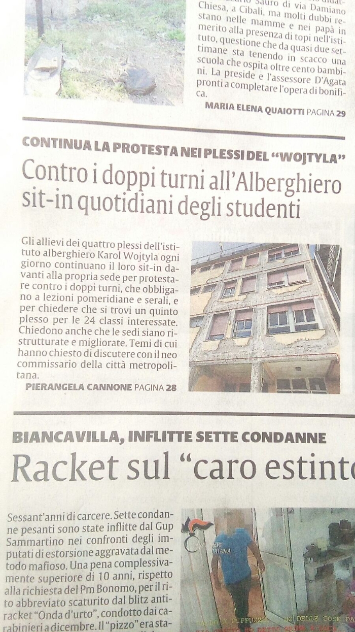Salve, sono una mamma dei ragazzi del plesso di via Raccuglia dell'Istituto alberghiero Karol Wojtyla di Catania. Intanto, grazie per il vostro aiuto... Sto scrivendo per farvi presente che anche questo plesso è nel degrado più totale, dentro la struttura c'è muffa e i pannelli delle pareti in alcune classi sono staccati... A questo punto non è solo un problema di mancanza di aule ma c'è anche un problema per la struttura dove si svolgono le lezioni. Io e tanti altri genitori vorremo evidenziare anche questo aspetto tramite voi... Secondo noi non si possono svolgere lezioni dentro quel plesso.
