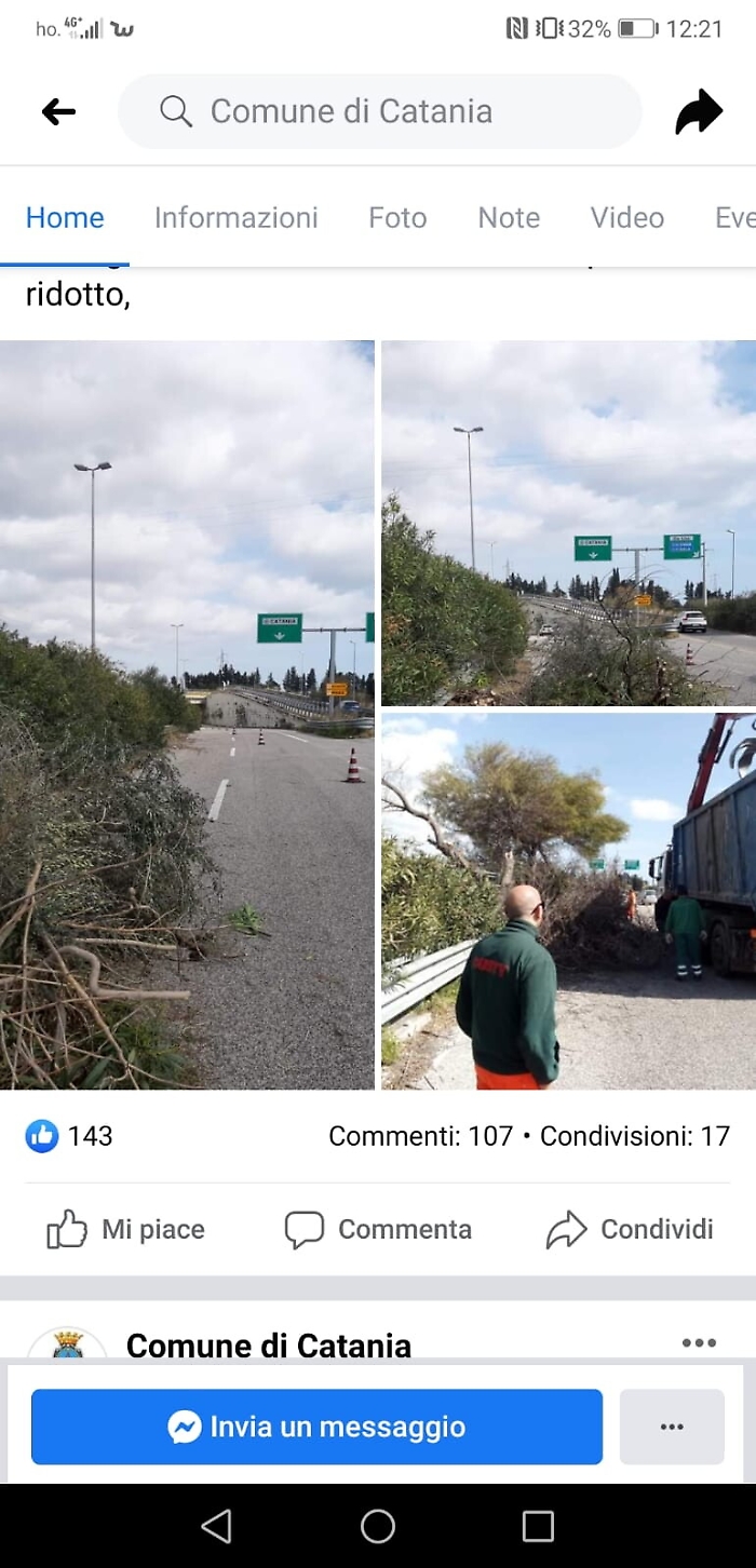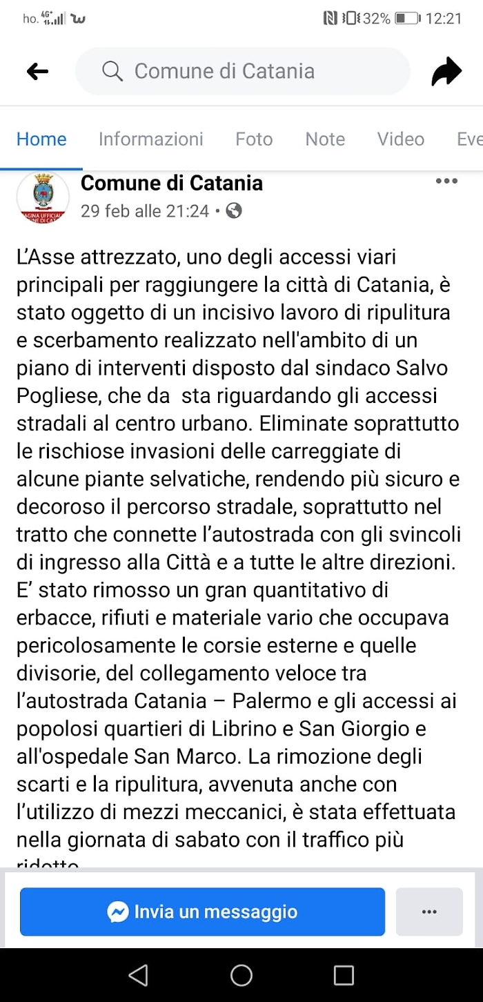 Sono un consigliere della sesta municipalità Ranno Davide volevo segnalare che il comune di Catania giorno 29 febbraio pubblicava sulla propria pagina ufficiale Facebook che si stavano eseguendo degli interventi sull'asse attrezzato (in prossimità dello svincolo "porte di Catania") in realtà hanno solamente tagliato 2 dei circa 20 alberi che invadono la carreggiata, sono passati 10 giorni e non ci sono stati più interventi e la situazione rimane molto pericolosa per gli automobilisti, cos'è una presa in giro?