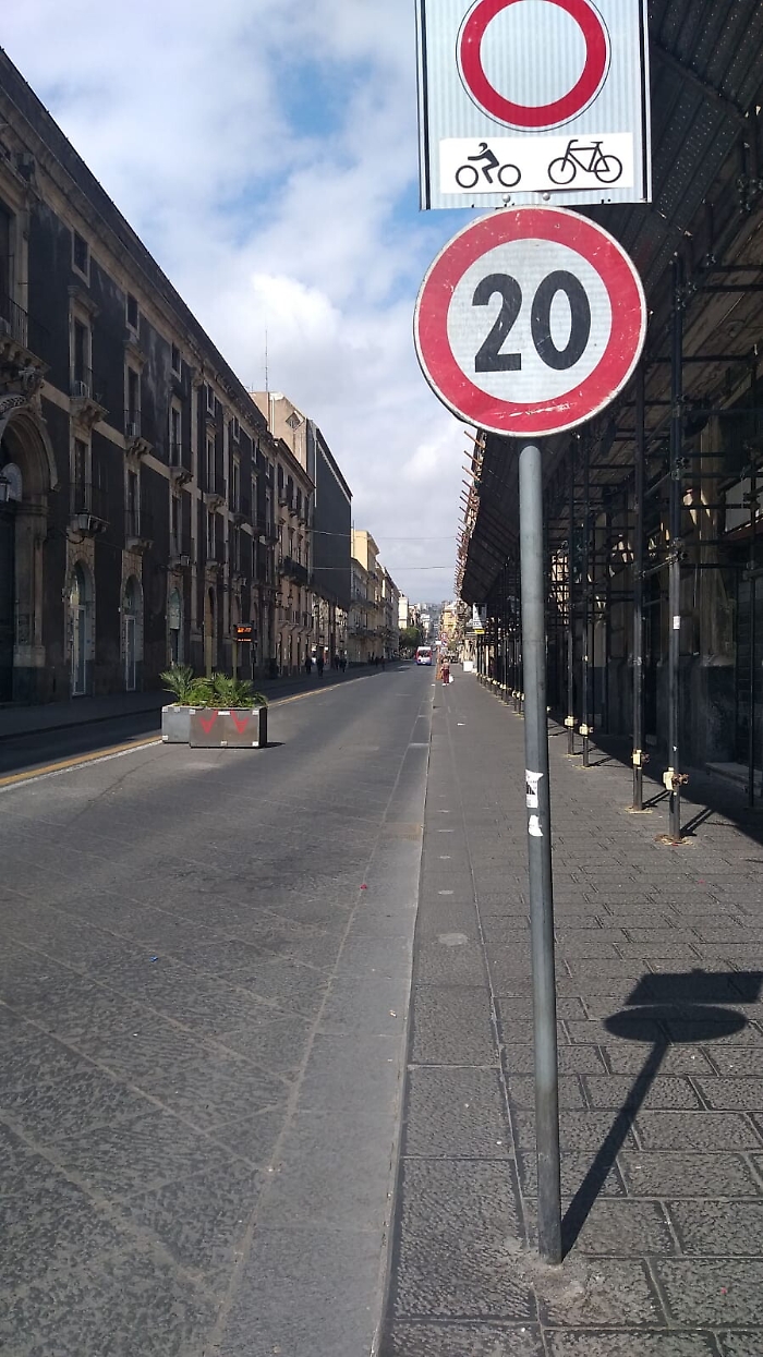 Lungo la via Etnea dopo più di un mese dalla festa di Sant'Agata ancora vige il divieto di circolazione per i motocicli. Una buona Amministrazione/gestione avrebbe già provveduto alla rimozione dei cartelli qualora questi ormai fossero considerati inutili per la sicurezza stradale. Il cartello che si trova in via Caronda con via Puleo è a mt.1.75 dal suolo è presenta gli angoli "vivi" e creano pericolo per le persone alte che transitano sotto di esso e sul marciapiede