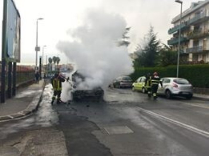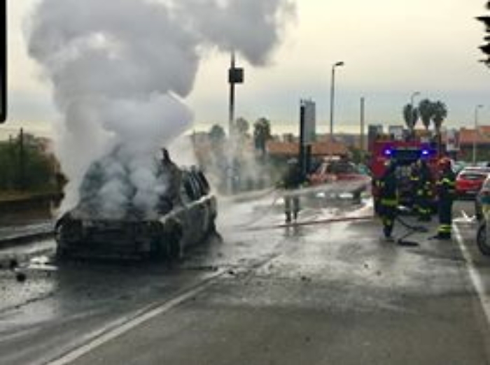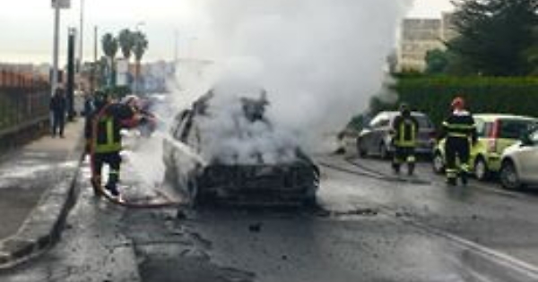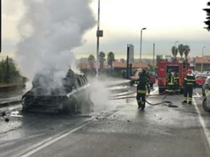 Catania ore 8.00, auto in fiamme in Via Nizzeti subito dopo il distributore Q8. Traffico paralizzato e panico tra la gente. L'intervento dei Vigili del Fuoco.