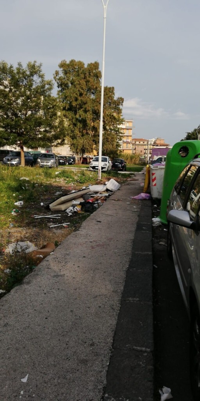 Via Rosina Anselmi altro scempio, costretti a camminare per strada perché il marciapiedi è già impegnato dai resti della discarica e da vetro.