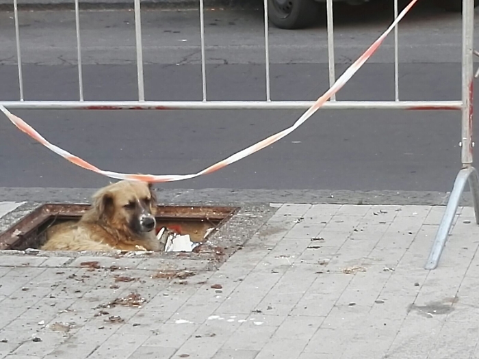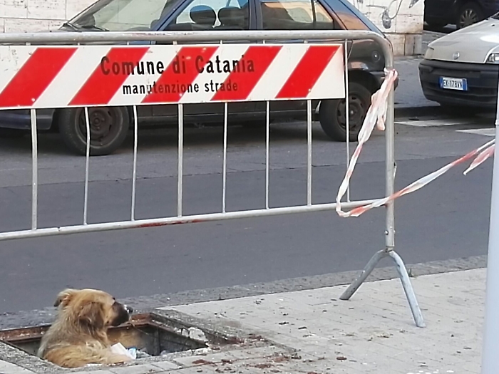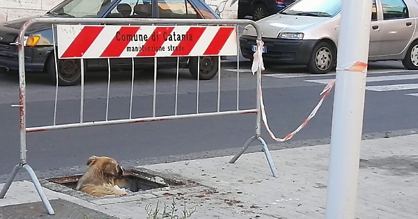 Catania, piazza Risorgimento: cane trova rifugio in caditoia senza grata