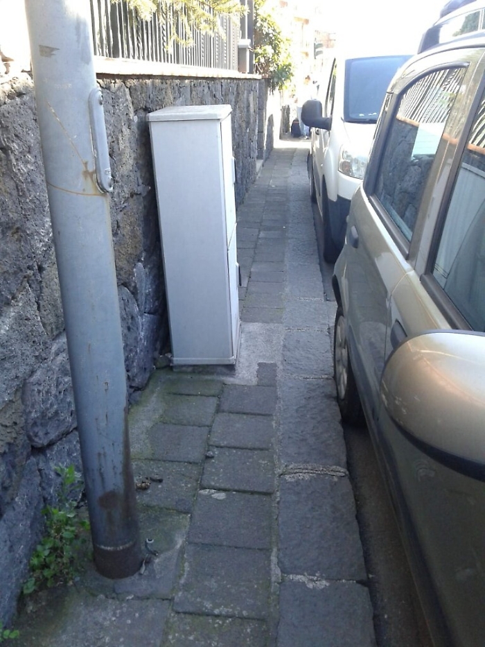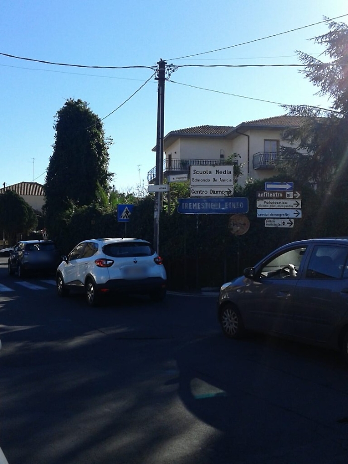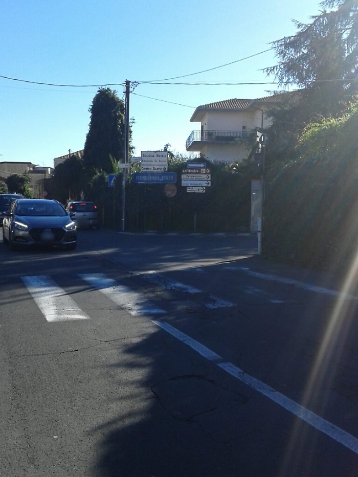 Sono un insegnante di scuola superiore. Stamane come di consueto accompagno mia figlia a scuola e nell'attraversare la strada, nelle strisce pedonali è stata investita: fortunatamente l'auto è riuscita ad effettuare una brusca frenata e l'ha appena toccata alla coscia sinistra. Volevo sensibilizzare lo stato in cui si trova un importantissimo attraversamento pedonale che si trova in Via Etnea a Tremestieri Etneo (CT) in prossimità dell'Istituto Comprensivo De Amicis, dove sistematicamente tutti i giorni da lunedì a venerdì dalle 7:30 alle 8:30 e dalle 13:30 alle 14:30 l'attraversamento pedonale è utilizzato dalla scolaresca. Strisce pedonali sbiadite dove la pittura bianca è scolorita, segnali stradali inesistenti: presenza scuola, rallentare, attenzione attraversamento pedonale, dissuasori di velocità, strisce orizzontali con piccoli rialzamenti per far vibrare l'intero veicolo. Un attraversamento abbandonato, dove tempo fa una bambina è stata investita e rimasta in coma per sei mesi. E allora! bisogna che ci scappi il morto prima di agire ? Stamane ha rischiato mia figlia, domani ? Siamo costretti a fare i salti mortali con gli zaini. Guardate il marciapiedi: strettissimo e con ostacoli.