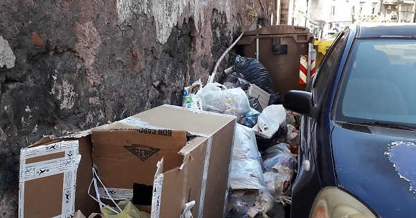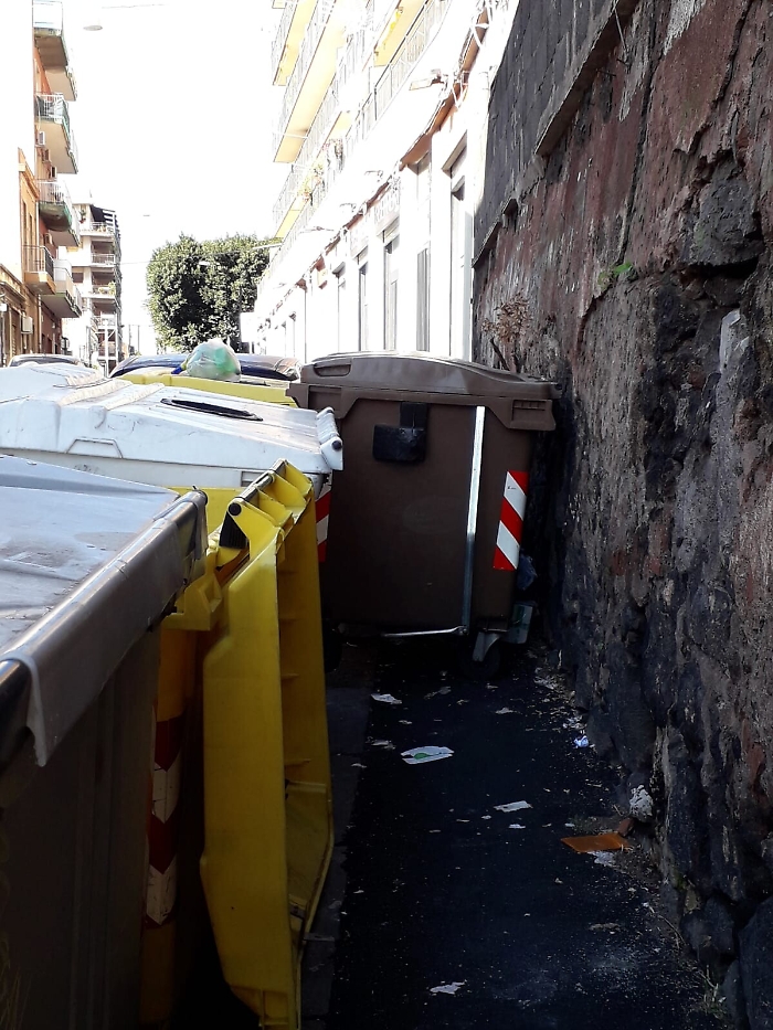 Catania: collocati 5 cassonetti per i rifiuti sopra il marciapiedi in Via del Bosco