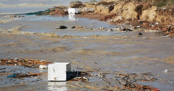 I resti dei fitofarmaci, medicinali usati in Agricoltura dalle aziende in zona che, alla fine dell'estate, gettano nel corso del fiume Dirillo che costeggia tutti gli impianti serricoli della fascia. Ora con le piogge tutto è finito a mare.