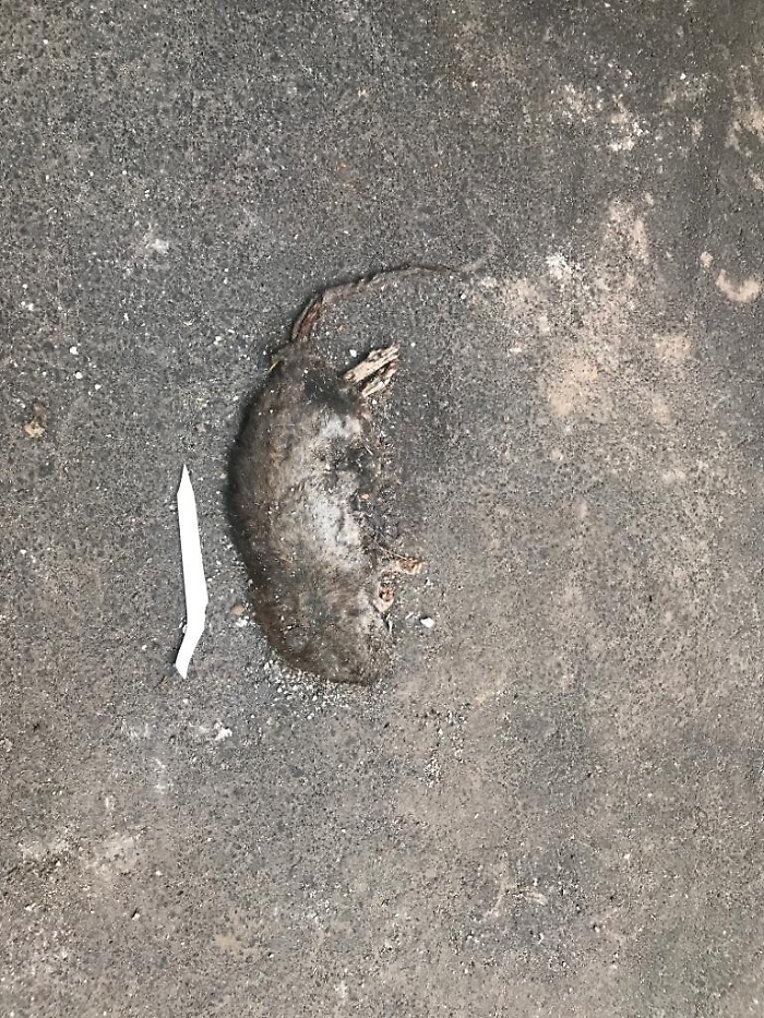 Via Toselli caserma dei Carabinieri. La pulizia della strada non è effettuata da così tanto tempo che il topo morto sull’asfalto nel frattempo si è addirittura mummificato...