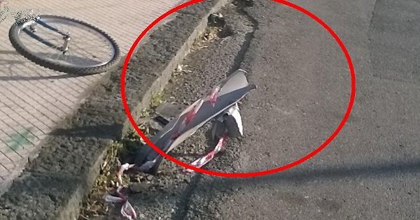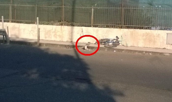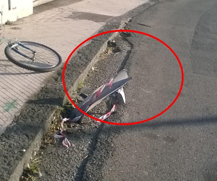 Vi sottopongo queste immagini, rappresentano lo spuntone del supporto del guard rail danneggiato, la strada è via Angelo Musco, indicativamente in corrispondenza del civico 35, ad Aci Castello (Catania).