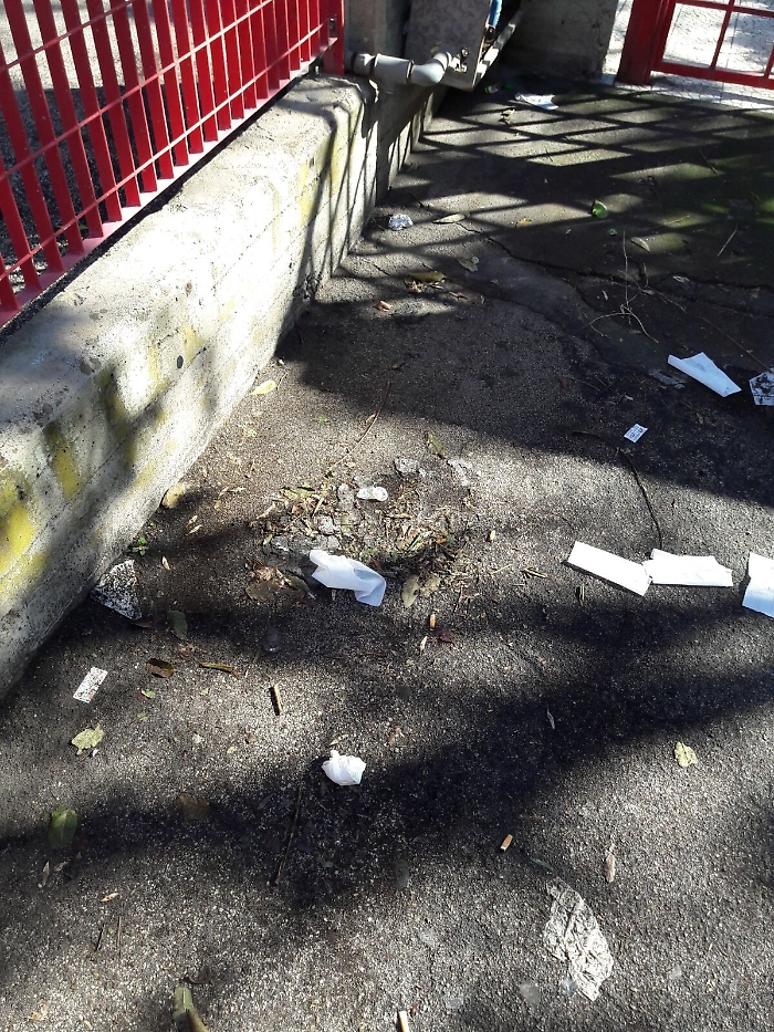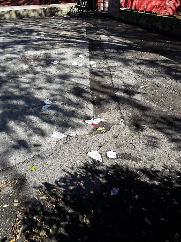 Catania - Sono la mamma di una bambina che frequenta la scuola Giovanni Verga esattamente il plesso di via Alcide de Gasperi. Sono stanca perché da anni facciamo segnalazioni per il fatto che la nostra scuola viene usata da coppiette che si appartano negli orari serali e notturni. Stamattina (29 ottobre) passando ho fatto queste foto. In passato è successo che questo schifo è stato trovato anche dentro la scuola. I bidelli a volte sono costretti a ripulire il tutto. A volte la mattina il Comune manda un netturbino a ripulire il tutto.... ma è capitato che qualche volta abbiamo trovato lo scempio. Spero che questa segnalazione serva a qualcosa.... e che il Comune prenda i giusti provvedimenti.