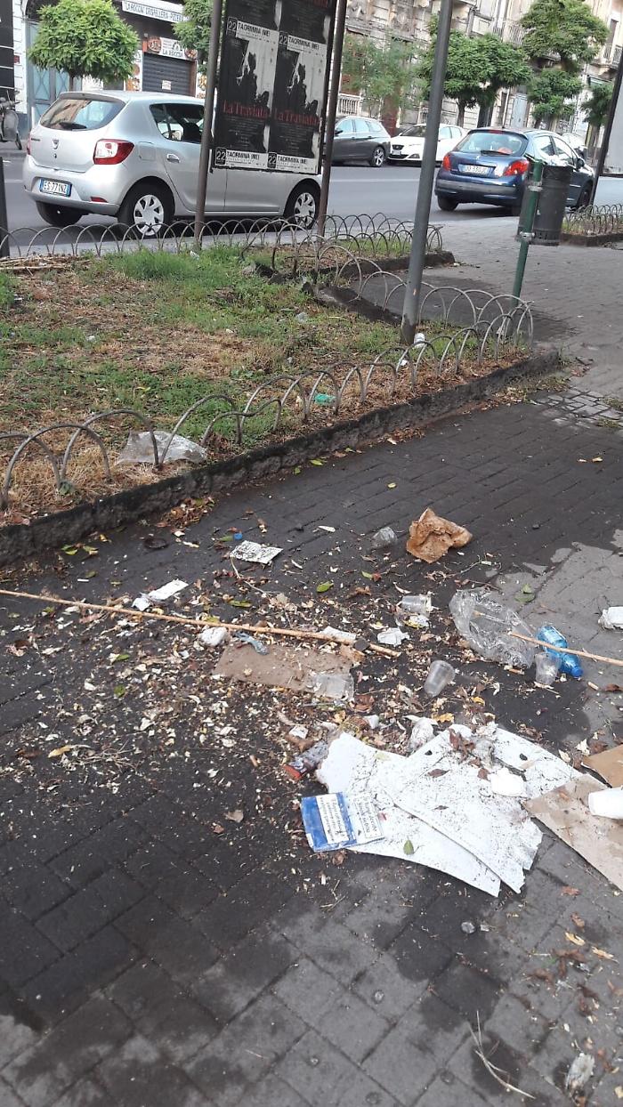 Piazza 2 Giugno tutti giorni si trova cosi... Sono un commerciante del Viale M. Rapisardi. Il degrado aumenta di giorno in giorno la piazza non viene spazzata da settimane i cassonetti quelli in piazza non vengono mai svuotati e la puzza è insopportabile
