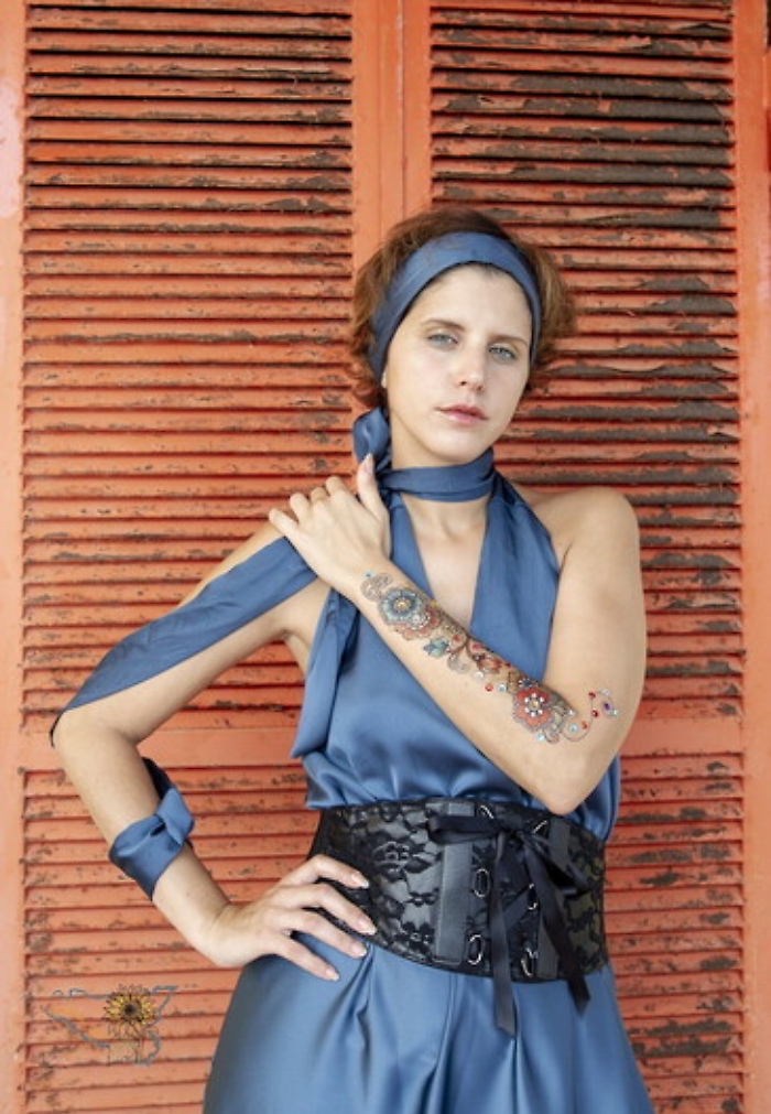 Ma la Sicilia è anche, e soprattutto, cielo e mare… L’uno riflesso dell’altro, volti limpidi e azzurri di madre natura, fonti ispiratrici del nostro immaginario onirico. Cielo e mare hanno ispirato la creazione di Sky, abito azzurro orgogliosamente indossato da Marta. Sky è un inno alla gioia, alla libertà plasmata su una nuda schiena, giardino di un decoro floreale esteso alle braccia e alle gambe, tele prestatesi all’arte di Debora Scarfia che tra petali e ornamenti ha conferito movimento ad un abito che ti veste sinuosamente, come un’onda serpeggiante tra gli anfratti di scogli smussati da una carezza eterna. Un’ampia cintura in ecopelle e pizzo nero consolida il dinamismo, l’eleganza e la sensualità dell’abito duettando con le movenze artistiche dei petali colorati.