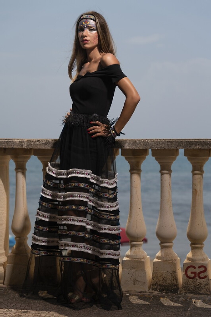 E’ così che lo specchio ha dato il benvenuto al volto decorato di Angela Crapanzano, la modella che ha indossato, con portamento navigato, un lungo abito nero con un corpetto a spalle scoperte impreziosito da un leggero piumaggio che esalta la snella vita dell’indossatrice e fa da prologo ad una gonna in tulle semitrasparente agghindata da una serie di decori e orlature circolari a specchio richiamanti i motivi del carretto siciliano.