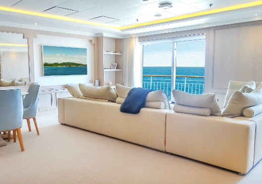 Gli appartamenti sono finemente arredati con salotti, ampie camere e cucine private. Il costo delle cabine varia da un milione di dollari fino a raggiungere la cifra record di 12 milioni di dollari. A bordo ci sono quattro ristoranti con chef di alto livello, negozi, stanze da biliardo e simulatori di golf, centri fitness, campi da tennis, pista di jogging, centri benessere, due piscine, la Clinique La Prairie che offre trattamenti orientali, una biblioteca, il cinema, il teatro e un grande bar per gli aperitivi al tramonto.