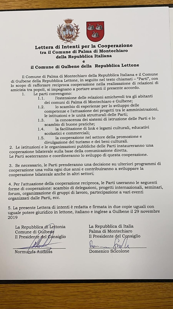 Una giornata storica per la città di Palma di Montechiaro che a Gulbene, in Lettonia, ha sottoscritto due gemellaggi, il primo con la città lettone, il secondo con la città di Tblisi in Georgia. Lo stesso gemellaggio ha interessato anche la scuola Tomasi di Palma di Montechiaro, rappresentata dalla dirigente scolastica, Laura Sanfilippo, con un istituto ginnasiale di Gulbene.