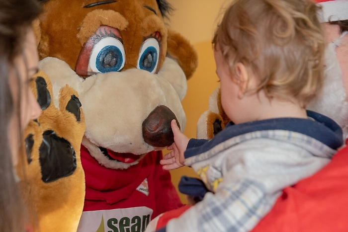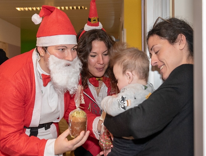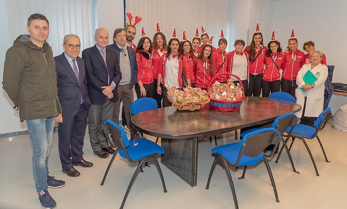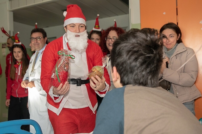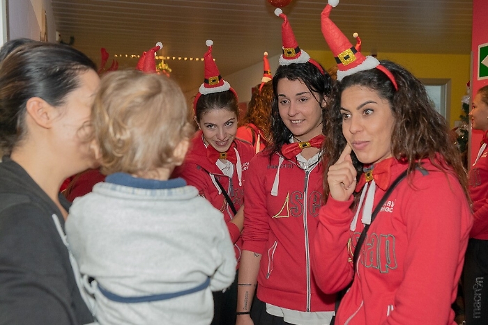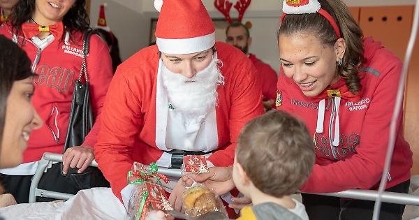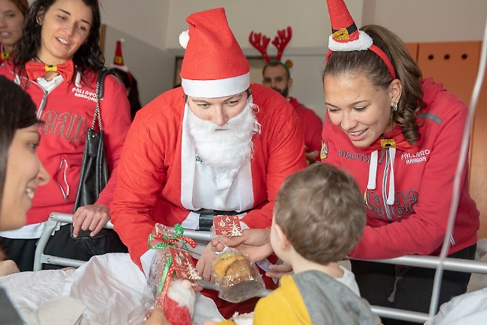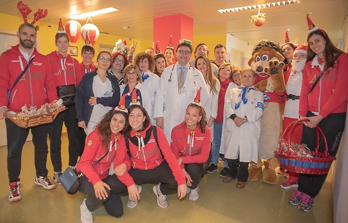 La Seap Pallavolo Aragona, questa mattina, si è recata in visita al reparto “Pediatria” dell’Ospedale San Giovanni di Dio di Agrigento, diretto dal dott. Giuseppe Gramaglia. Le giocatrici con addosso cerchietti natalizi ed il capitano Francesca Cusumano vestita da Babbo Natale, accompagnati dal medico sociale del Club, il dott. Antonino Cinà e dalla mascotte “Leonida”, hanno visitato tutte le stanze del reparto, intrattenendosi con i piccoli pazienti e consegnando loro giocattoli e panettoni, quest’ultimi offerti dalla ditta “Le dolcezze della Valle dei Templi” di Maria Teresa Schembri. La squadra biancazzurra del Presidente Nino Di Giacomo, molto attiva nel sociale e nella promozione della cultura del sostegno, ha donato sorrisi e portato momenti di gioia e divertimento ai piccoli ospiti del reparto di “Pediatria”, approfittando dell’occasione per augurare una pronta guarigione ai bambini e buon lavoro agli operatori sanitari impegnati quotidianamente nel servizio di cura e assistenza. L’iniziativa è stata accolta con entusiasmo e partecipazione dalle giocatrici e dall’allenatore Francesco Eliseo. Continua così il percorso di responsabilità sociale della Seap Pallavolo Aragona che ha voluto dare seguito all’iniziativa di lunedì scorso con la consegna delle derrate alimentari alla “Mensa della Solidarietà” di Agrigento per contribuire a soddisfare i bisogni della gente che vive in stato di indigenza. I vertici dell’Asp di Agrigento e il dott. Giuseppe Gramaglia hanno ringraziato la Società Seap Pallavolo Aragona per la visita che dimostra l’attenzione per la città e per i piccoli ospiti ricoverati.