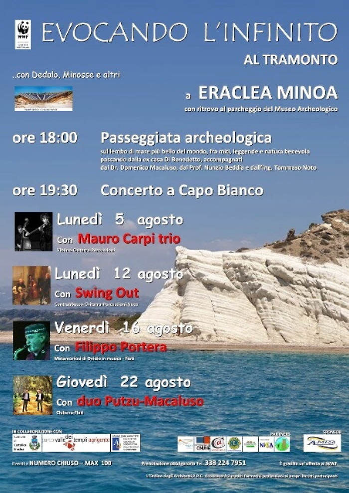 Con l'ultimo concerto del Duo Putzu Macaluso si è conclusa la rassegna "Evocando l'infinito" organizzata dal WWF Sicilia Area Mediterranea sulla cresta di Capo Bianco, accanto al Museo Archeologico di Eraclea Minoa.