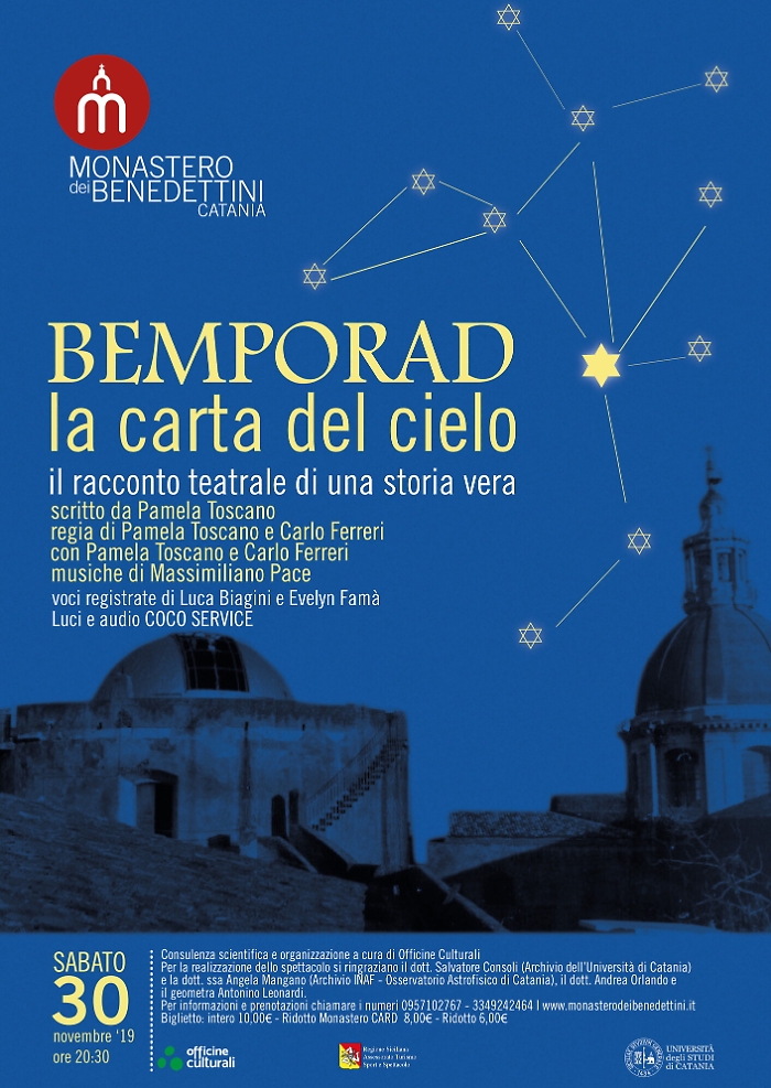 Catania - Sabato 30 novembre 2019 alle 20,30 l’Auditorium Giancarlo De Carlo del Monastero dei Benedettini si trasforma in palcoscenico per raccontare la storia di uno scienziato piena di contraddizioni e di passioni. Officine Culturali, in collaborazione con il Dipartimento di Scienze Umanistiche dell’Università di Catania, invita i catanesi a ripercorrere le tappe della vita di Azeglio Bemporad, illustre matematico e astronomo, docente di Astrofisica e Geodesia per l’Università di Catania e Direttore del Regio Osservatorio di Catania, che ha avuto sede proprio al Monastero dei Benedettini dal 1890 alla seconda metà degli anni’60.