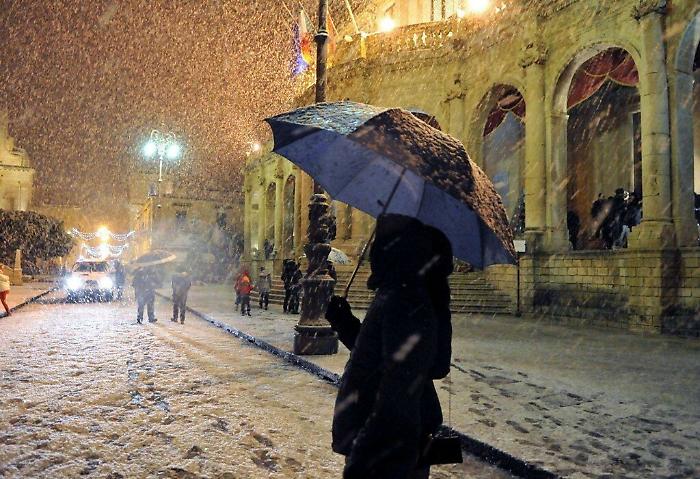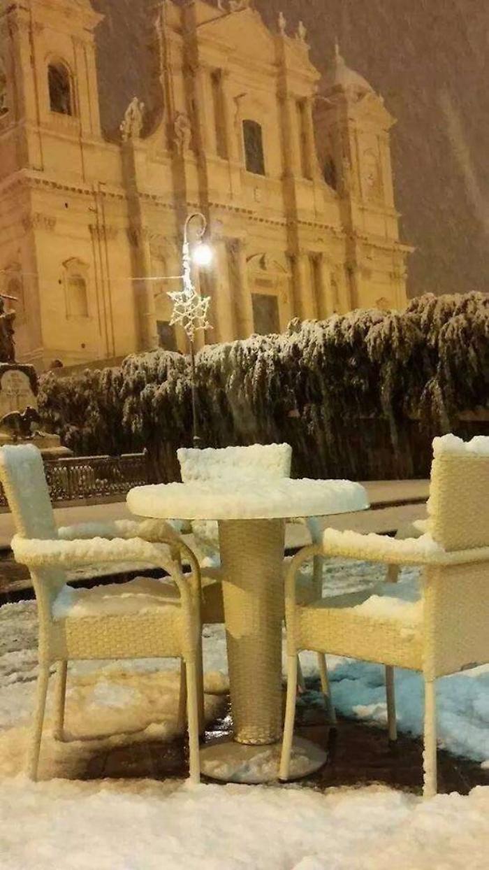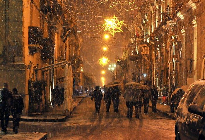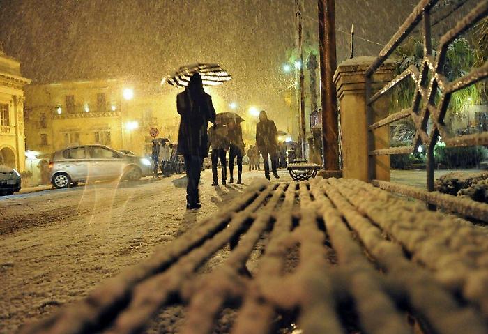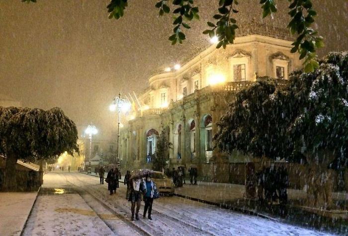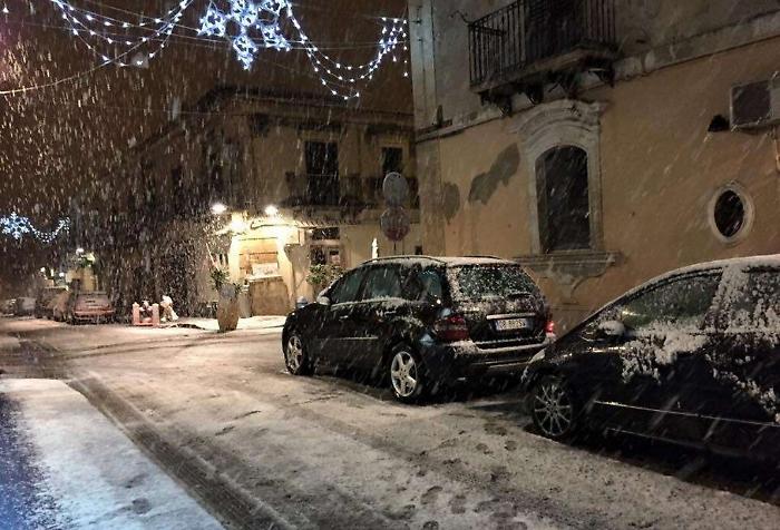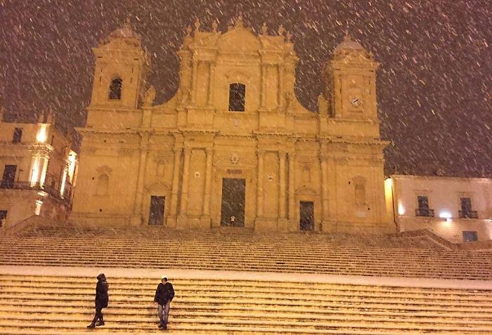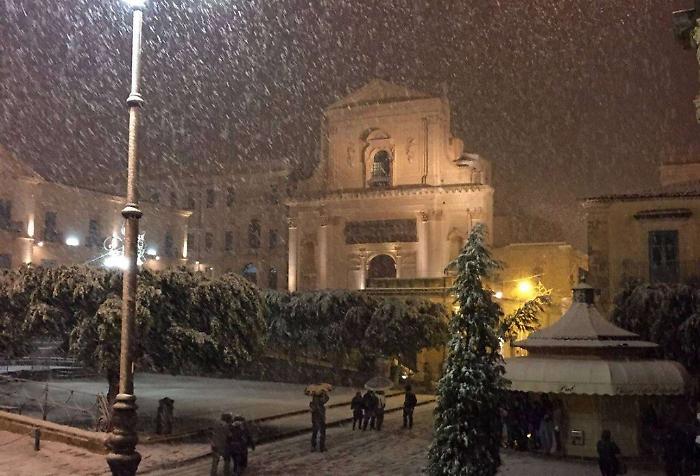 Quando i primi fiocchi di neve, subito dopo la mezzanotte sono caduti sulle città della zona sud della provina di Siracusa, la prima reazione è stata di stupore, di meraviglia. C’era chi la neve non l’aveva mai vista in vita usa, e chi, fra i turisti, non si aspettava questo clima nel profondo sud d’Italia. Per tutta la notte non c’è stato capodanno in piazza o festa privata che reggeva il paragone: la neve era l’attrazione principale. Uno scenario inusuale che ha reso per qualche ora magico il paesaggio. La Basilica di Noto innevata, la spiaggia di Avola ricoperta di neve, il borgo marinaro di Marzamemi totalmente “imbiancato”. Un fascino che si è trasformato in disagio prima e in emergenza dopo.
