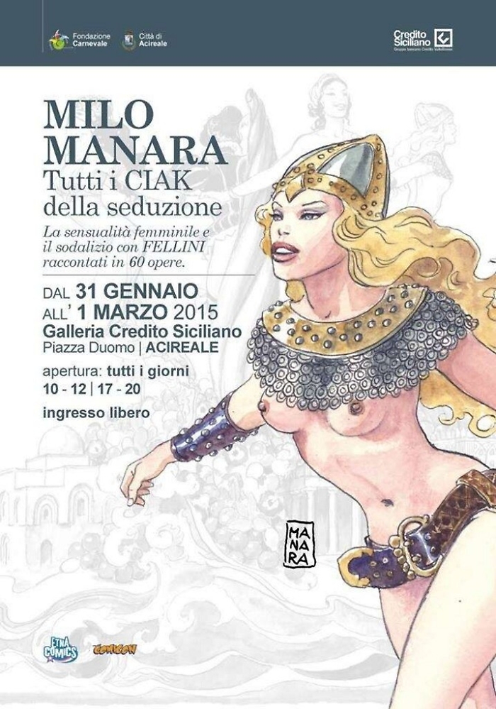 Ecco alcune immagini di Milo Manara ad Acireale per inaugurare la mostra «Milo Manara - Tutti i ciack della seduzione. La sensualità femminile e il sodalizio con Fellini raccontati in 60 opere», che resterà aperta, a ingresso libero, alla galleria del Credito Siciliano fino al primo marzo. In mostra ha anche i sette bozzetti che Manara ha realizzato proprio su commissione della città per un carro allegorico che sarà allestito il prossimo carnevale. Manara ha incontrato i carristi, ma c’è stato anche un emozionante incontro con l’artigiano Domenico Di Mauro, maestro dei carretti siciliani.