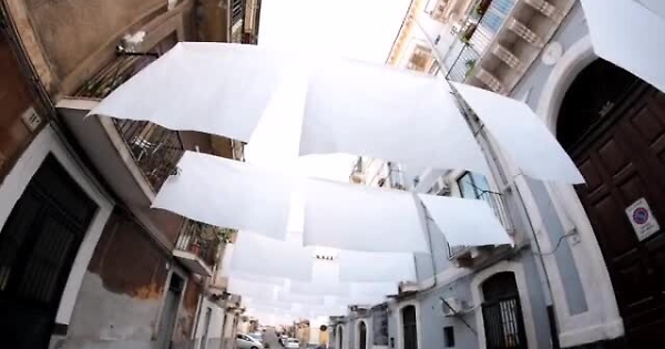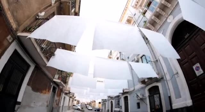 CATANIA - Molto più di semplici panni bianchi stesi perchè in via Santa Barbara, nel cuore storico di Catania, si dà vita ad un catalizzatore di colori e luci che affascina e, al tempo stesso, incuriosisce tutti coloro che vengono rapiti da quest'insieme di panni che pendono sulla strada dai fili. Un "bucato" artistico che imbianca il cielo: "White Sky" (Cielo bianco) è il titolo dell'intervento di “street art” realizzato dall'artista Giuliano Cardella e voluto dall'associazione Acquedotte_Arte, Architettura, Aree Urbane, impegnata nella valorizzazione del centro storico, in collaborazione con il Comune di Catania.