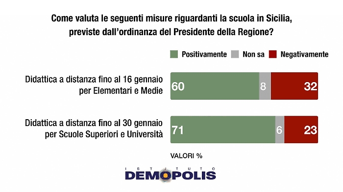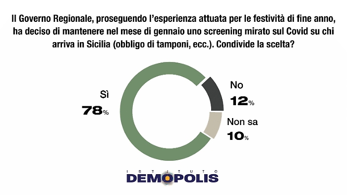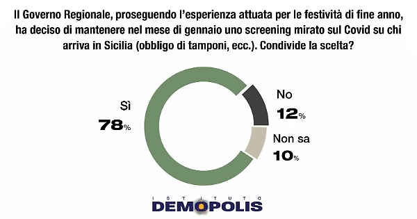 «Accolgo con soddisfazione l'esito del sondaggio di Demopolis che conferma come la stragrande maggioranza dei siciliani sia favorevole alle misure restrittive che abbiamo dovuto adottare nelle ultime ore. Un terzo dei siciliani, addirittura, vorrebbe misure più stringenti. Certo, se non ci fosse stata durante le festività la indisciplina di una ristretta minoranza, che impone a tutti gli altri enormi costi sociali ed economici, non avremmo avuto necessità di chiedere a Roma di diventare "zona arancione". Auspico che i prefetti ed i sindaci diano disposizioni più rigorose alle Forze dell'ordine ed alla polizia municipale affinché la vigilanza, soprattutto nei luoghi della movida, sia diffusa e più efficace. Al tempo stesso, vorrei assicurare i nostri operatori economici di avere già inoltrato al presidente Conte una lettera, firmata assieme ai colleghi delle altre quattro Regioni arancione, per chiedere che il Governo ci fornisca doverose e puntuali rassicurazioni circa un'immediata messa in campo di ristori e della loro quantificazione, come previsto per le zone rosse, onde evitare ulteriori penalizzazioni alle categorie operanti nelle attività produttive, commerciali, ricettive, turistiche, gastronomiche, sportive e ricreative, affinché venga scongiurato il rischio, assai concreto, che interi comparti vengano definitivamente cancellati dalla geografia delle nostre Regioni». Lo dichiara il presidente della Regione Siciliana Nello Musumeci commentando i risultati del sondaggio Demopolis sull'apprezzamento, da parte del 70% dei siciliani, delle misure relative alla "zona arancione".