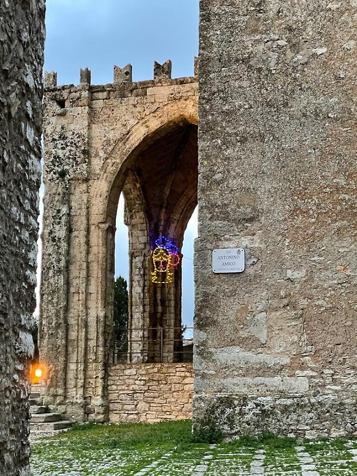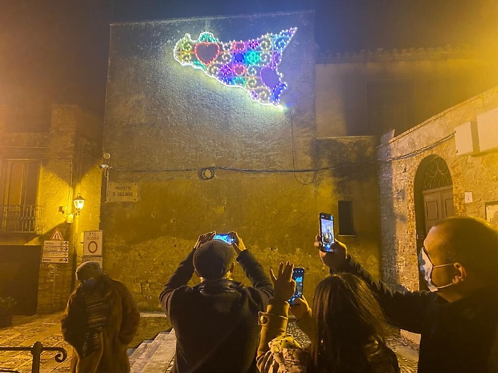 Ad accendersi di luce sono la Porta Trapani, con gli iconici occhi di Santa Lucia, opera-guida del progetto di Pellegrino che ogni anno fa una tappa diversa (dopo Palermo, Torino e il Museo del Sale a Petralia, il 2020 è la volta di Erice); i paladini Orlando e Rinaldo sono alla Chiesa Matrice; la Sicilia in Piazza San Giuliano; gli Amori sono nell'Orfanatrofio San Carlo annesso al Monastero dove le mani delle suore di clausura hanno dato vita alla migliore tradizione dolciaria di Erice. "E l'Italia davanti all'aula magna della Fondazione Majorana - aggiunge Guerri - vuole essere un omaggio al luogo che ha reso celebre Erice in Italia e nel mondo in epoca contemporanea, con le centinaia di migliaia di scienziati giunti sulla vetta". La colonna sonora lungo il percorso delle luminarie artistiche è curata da Viola Costa, direttrice artistica del Festival Vittoriale.