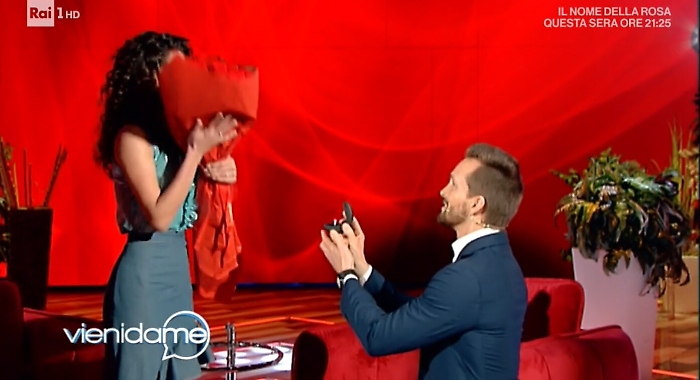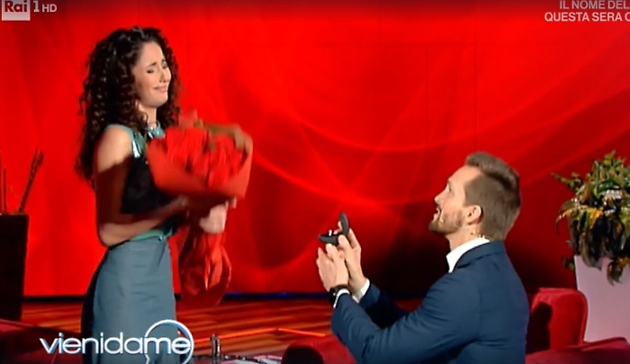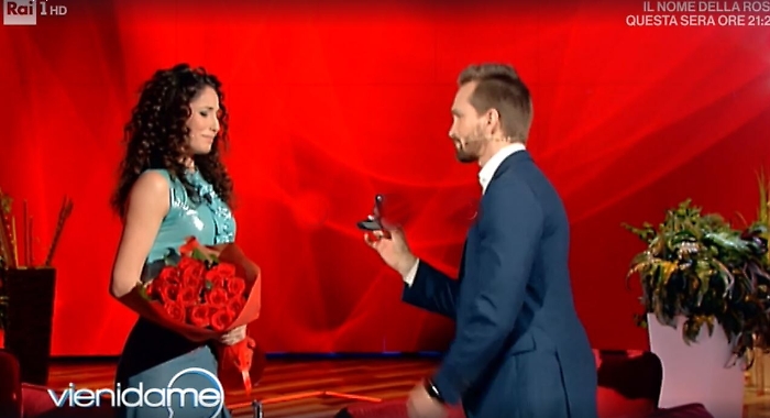 Momenti di pura emozione per Vera Santagata, una delle "professoresse" de "L'Eredità". Li ha vissuti nel corso di una puntata di "Vieni da me", la trasmissione di Caterina Balivo che l'ha invitata con la scusa di dover partecipare ad un gioco telefonico. Vera, ballerina e ginnasta oltre che showgirl, non si sarebbe mai aspettata che il suo compagno, l'attore e conduttore televisivo Dino Lanaro, potesse sorprenderla con la sorpresa di una proposta di matrimonio. Così è stato. Caterina e Dino, con la complicità di Flavio Insinna, hanno organizzato la richiesta con tanto di anello e proposta in ginocchio. E gli occhi già belli di Vera hanno brillato ancor di più. Dino, che è padre di una bambina che vive con la coppia, ha ricevuto un bel sì.