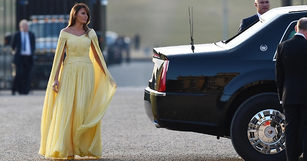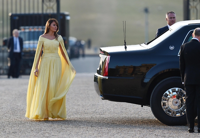 Mentre suo marito, il presidente degli Stati Uniti Donald Trump, è stato accolto da una contestazione, lei, Melania, continua a registrare più successo del consorte ovunque vada. E così è stato anche a Londra dove mister president si è recato ieri 12 luglio, per una "visita di lavoro" di due giorni. La statuaria Melania non lo fa di certo sfigurare. Bella e perfetta nei suoi look, è stata particolarmente ammirata alla cena di gala offerta dal primo ministro inglese Theresa May a Blenheim Palace. La first lady americana si è presentata con un sontuoso vestito da sera giallo di Manolo Blahnik, colore del tutto contrapposto a quello scelto dalla May che ha optato per un abito rosso, sempre lungo, con le braccia scoperte e spacco posteriore e con decolletè della stessa tinta. E se per la cena, Melania ha scelto un vestito che la faceva assomigliare ad una moderna dea greca o per qualcuno, più ironicamente ad una principessa Disney, per l'incontro più istituzionale con la regina Elisabetta ha invece preferito indossare un accollatissimo tailleur chiaro e raccogliere i capelli.