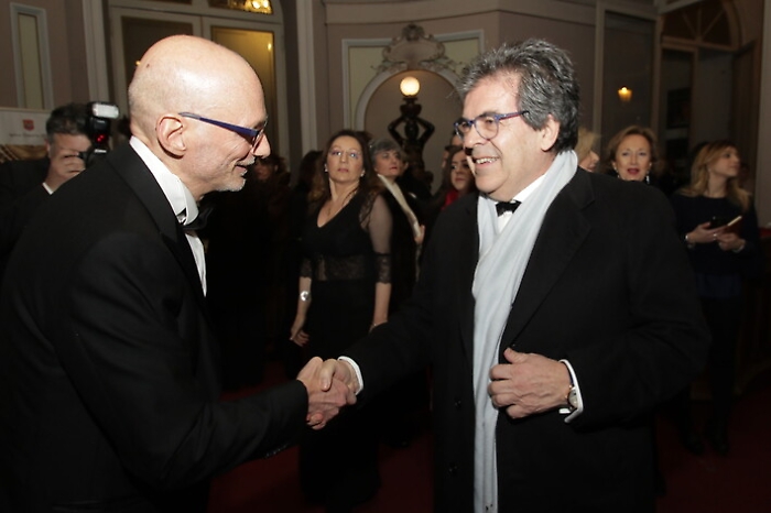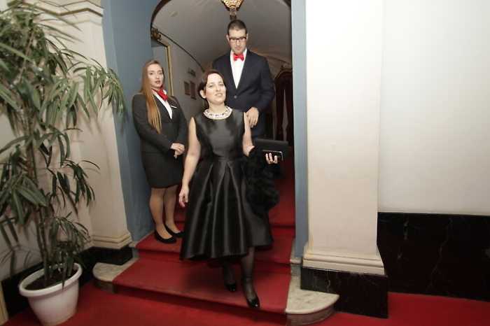 Veniamo alle principesse dunque. Caterina Andò era in Gae Aulenti, o forse era Gae Alunti a essere in Caterina Andò, perché, se parliamo di tiatro, Caterina aulentissima è più potente dell’Aulenti. Emilia Doriana Maria Mignemi, famosa per le sue mise eccentriche ma azzeccate, era in tuta glam sbrilluccicante che sembrava lo specchio dell’acqua del lago quando che ci si riflette sopra la luna, o una cosa del genere. Splendida, come sempre, la chilometrica top Desirée Aresco, che non si capiva bene se era più lunga lei o era più lungo il lungo che indossava, e in tutta questa meravigliosa chilometricità uno non può che provare simpatia per Enzo Costantino, perfetto smoking, che ogni volta che piglia Desirée sottobraccio ci scatta il telepass della macchina. A proposito di smoking perfetti da segnalare quello dei fratelli Bond, Nico e Giovanni Torrisi, accompagnati da due top model: Bice Cicirata, splendida in un abito interamente di pizzo e macramé e Maria Paternò in un tubino semplicissimo e perfetto fino a quando non si voltava svelando un abisso di scollatura sulla schiena. Amanda Succi indovina l’autoironia in un tailleur pantalone di velluto di seta e camicia bianca che richiama uno smoking maschile, accompagnata da Enzo Bianco nell’ormai immancabile smoking a doppio petto che è un tratto distintivo. Molte le mise ispirate al chiarore del lago sul quale la “straniera” si pinna e si sbatte la testa mura mura, ne citiamo due: Laura Foti, in bianco adornato da paillettes e pelo… “sono animalista”… e pelo sintetico, e Claudia Catalano, in bianco e azzurro mosso da un vortice di sentimento e passione, più o meno.