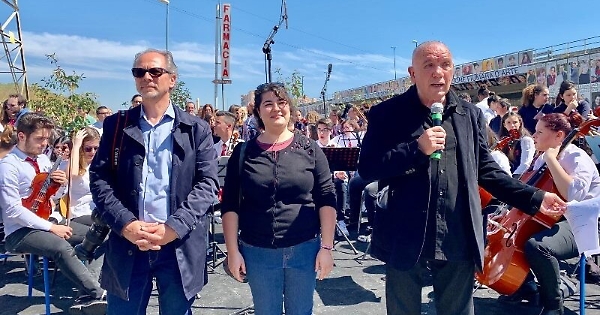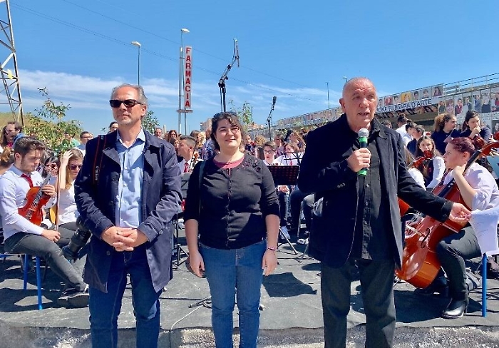 «Il Cantico segna un percorso iniziato anni fa con la Porta della Bellezza – ha spiegato la dirigente dell’Istituto Musco Cristina Cascio - che ha lasciato un’impronta forte, unendo tutti nell’intento di riappropriarci di un’identità che sembrava perduta. Oggi questo cammino si riapre grazie ad Antonio Presti, con le immagini della gente che testimoniano la vivacità e la voglia di lanciare segnali forti nel nostro territorio. È un percorso di bellezza interiore su cui vogliamo scommettere, in primis attraverso le scuole, agenzie educative che devono trasferire quel senso civico di cui si nutre il mondo». Mani sul petto per cantare l’Inno di Mameli, con la consapevolezza che occorre stare uniti per superare la linea di confine dell’ombra, che a volte vela la quotidianità con problemi e criticità: «Lo Stato è vicino a Librino per sostenere i cittadini – ha dichiarato il prefetto di Catania, Sua Eccellenza Claudio Sammartino - l’opera che Presti, insieme a voi, sta consegnando alla città, rappresenta un grande incoraggiamento per continuare a lavorare; un contributo prezioso offerto con grande generosità. In questo momento difficile e delicato per il capoluogo etneo, proprio dalle periferie deve partire il cambiamento. Librino ci ha messo la faccia e questo è un contributo che ognuno di voi ha dato in maniera decisiva per il futuro».