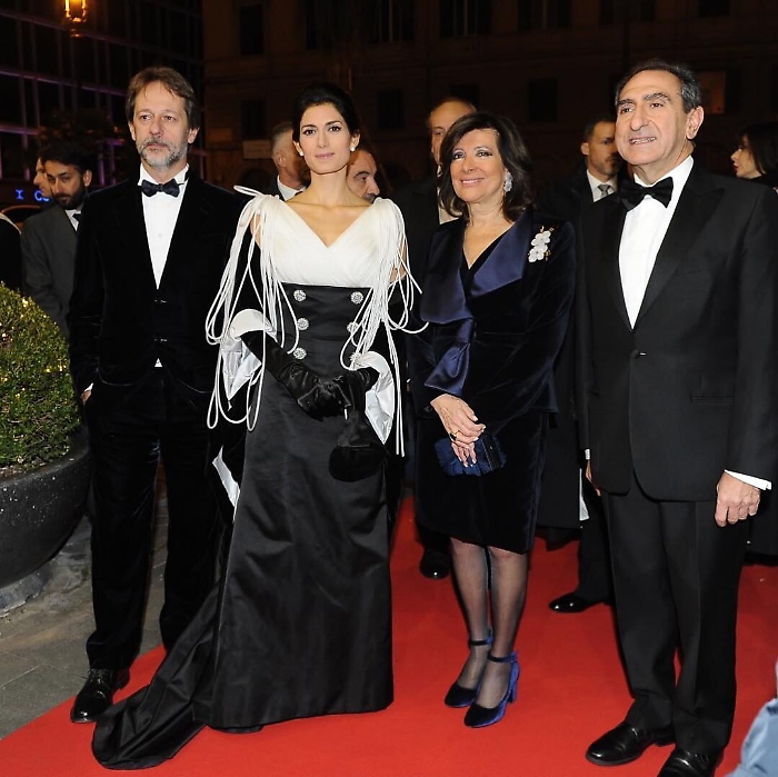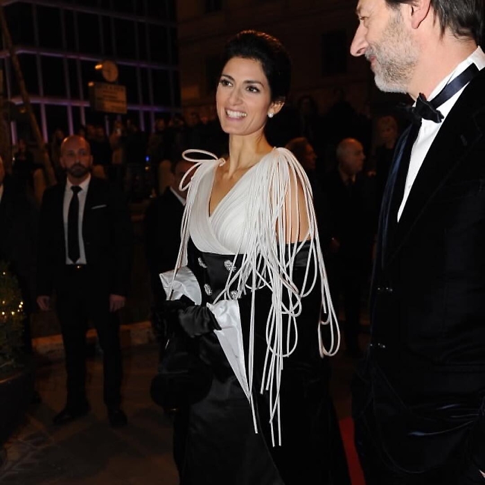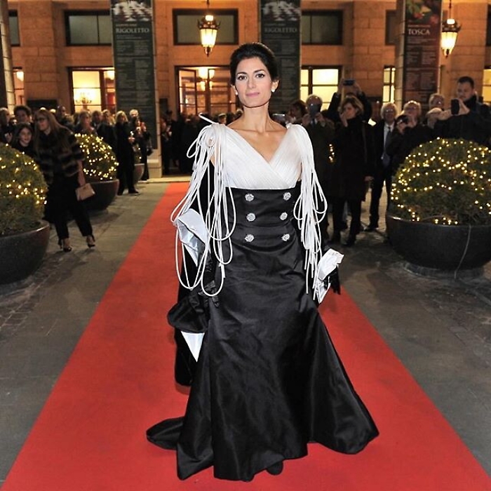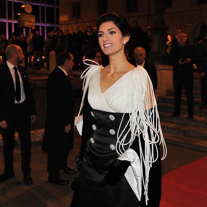 Roma - Lunga gonna nera in radzmire dalla linea a sirena indossata su un corpino bianco con ampio scollo a V lavorato con centinaia di budellini di organza che modellano perfettamente il corpo per poi cadere liberi sulle spalle. E' l'abito che ha indossato la sindaca di Roma Virginia Raggi domenica 2 dicembre, in occasione dell'apertura della stagione lirica presso il Teatro dell'Opera di Roma. E' stato ideato e realizzato appositamente per lei dallo stilista Camillo Bona. Il tutto è completato da una cappa di velluto nero doppiata di seta bianca e da lunghi guanti di raso nero.